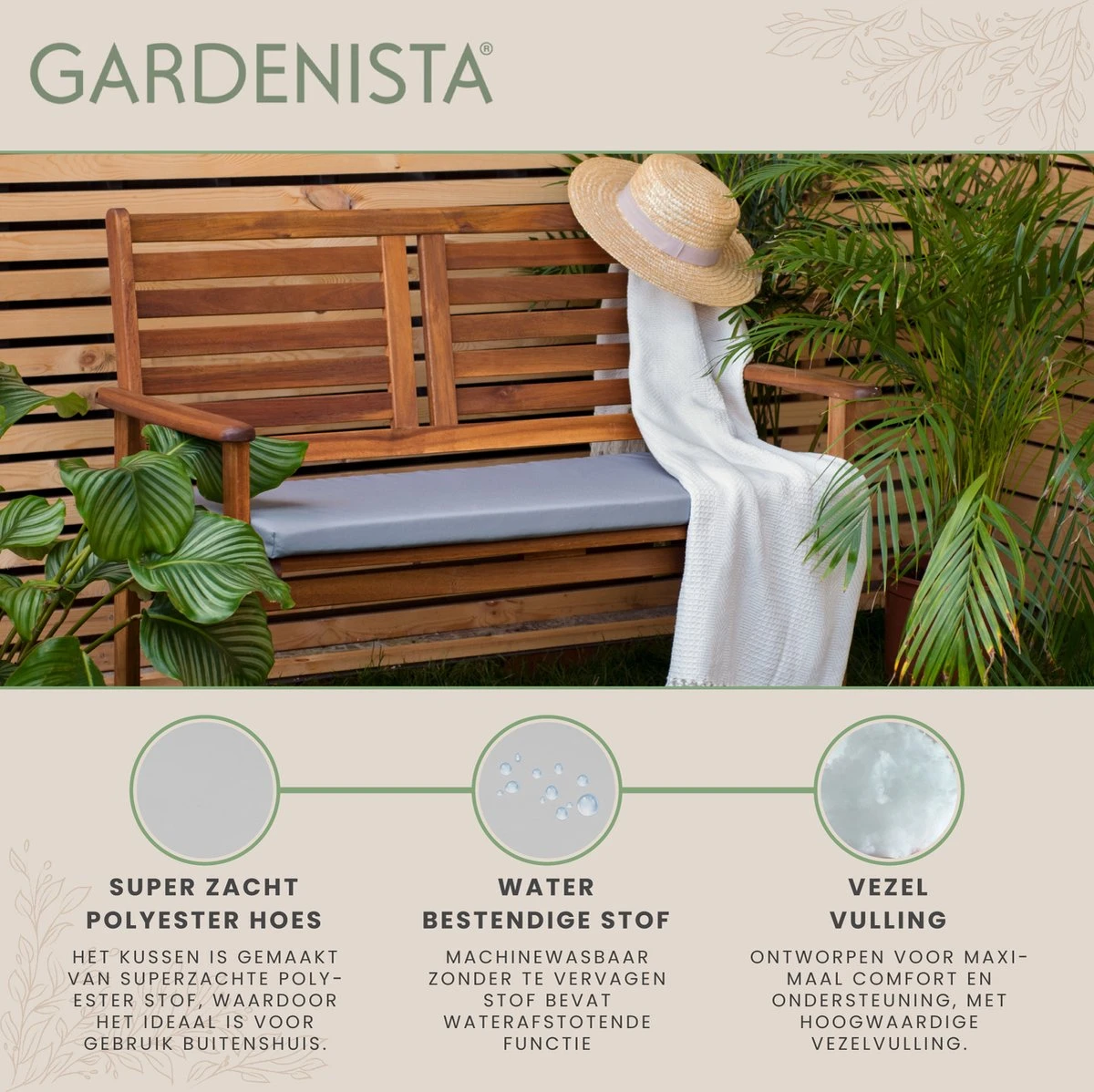 Design simple : ces coussins de banc de jardin vibrants sont conçus avec un matériau résistant à l’eau de haute qualité. Le kussen adoucira votre banc de jardin en dur avec ce kussen qui égayera la véranda et lors de son utilisation apportera un confort d’assise.(COUSSIN UNIQUEMENT) MATÉRIAU : La housse du coussin de siège est 100 % polyester et le coussin de siège lui-même est rempli de mousse, ce qui le rend léger, durable et surtout confortable. FACILE À NETTOYER : Il est facile à nettoyer grâce au polyester hydrofuge si facile à essuyer et à nettoyer. La housse est amovible et peut être lavée en machine. MESURE : Le coussin de kussen de canapé mesure 108 cm de largeur x profondeur 45 cm x épaisseur 5 cm, ce qui en fait un coussin de canapé 2 places . kussen AUX PAYS-BAS : Le coussin de kussen de canapé est conçu et fabriqué par Gardenista selon un standard élevé et fabriqué aux Nederland. Remarque : ce produit n’est qu’un kussen, il n’inclut pas de banc.