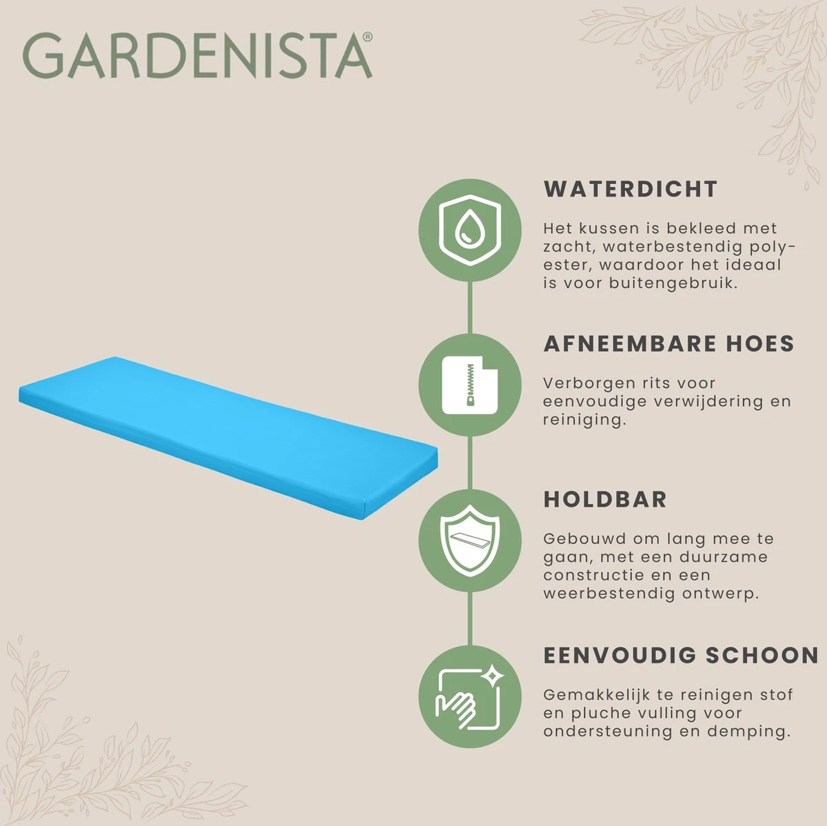 Design simple : ces coussins de banc de jardin vibrants sont conçus avec un matériau résistant à l’eau de haute qualité. Le kussen adoucira votre banc de jardin en dur avec ce kussen qui égayera la véranda et lors de son utilisation apportera un confort d’assise.(COUSSIN UNIQUEMENT) MATÉRIAU : La housse du coussin de siège est 100 % polyester et le coussin de siège lui-même est rempli de mousse, ce qui le rend léger, durable et surtout confortable. FACILE À NETTOYER : Il est facile à nettoyer grâce au polyester hydrofuge si facile à essuyer et à nettoyer. La housse est amovible et peut être lavée en machine. MESURE : Le coussin de kussen de canapé mesure 108 cm de largeur x profondeur 45 cm x épaisseur 5 cm, ce qui en fait un coussin de canapé 2 places . kussen AUX PAYS-BAS : Le coussin de kussen de canapé est conçu et fabriqué par Gardenista selon un standard élevé et fabriqué aux Nederland. Remarque : ce produit n’est qu’un kussen, il n’inclut pas de banc.