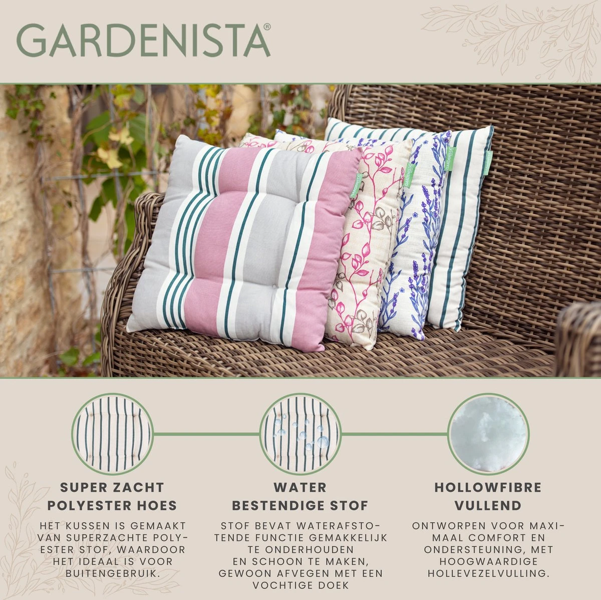 Le coussin de chaise de jardin est rempli de fibres creuses pour que vous puissiez vous asseoir confortablement. La housse est en toile de coton traitée, résistante à l’eau. Parce que la housse de coussin est en tissu hypoallergénique, vous n’avez pas à vous soucier des allergies.