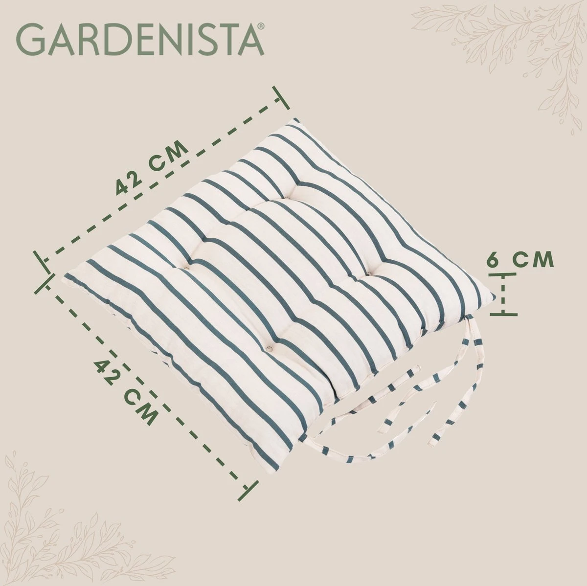 42 cm (longueur) x 42 cm (largeur) x 6 cm (épaisseur). Ce coussin de jardin s’adapte parfaitement à votre chaise de terrasse de jardin.