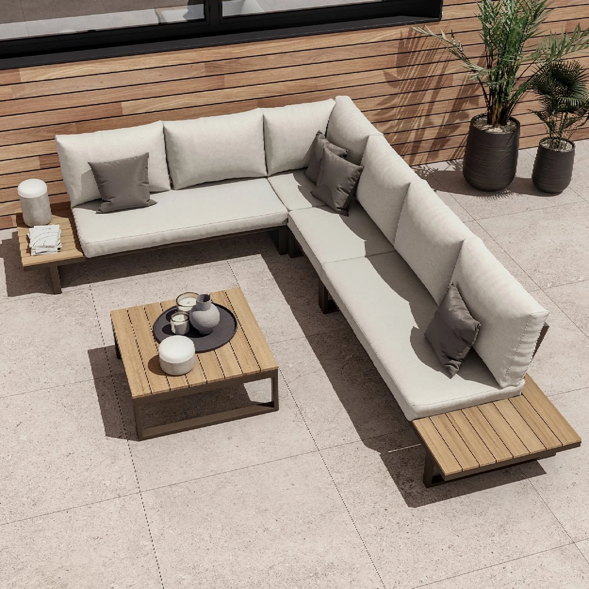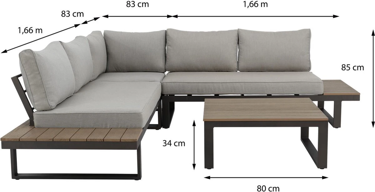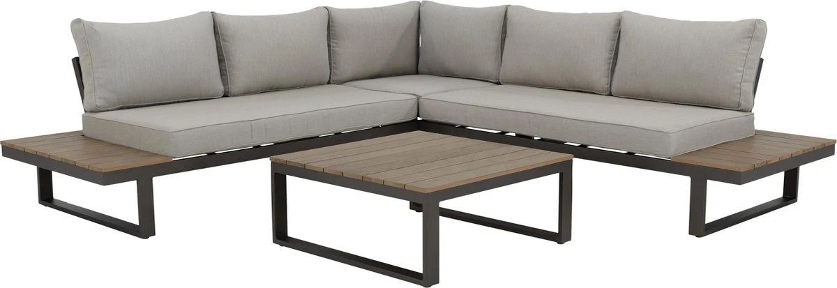 Avec le set d’angle San Diego vous pourrez recevoir vos amis et votre famille pour un moment agréable et cosy. Le canapé d’angle peut accueillir confortablement 5 personnes. Il a un avantage fonctionnel : la structure se prolonge aux extrémités, de sorte que vous puissiez garder vos objets du quotidien à portée de main. Le canapé d’angle San Diego est en partie en bois d’eucalyptus. Ce bois tropical, semblable au teak, a une densité élevée qui le rend très résistant à l’humidité, aux rayons UV et aux changements climatiques. Le bois d’eucalyptus utilisé provient d’une sylviculture respectueuse de l’environnement. Conçus pour un confort optimal, les coussins ont reçu un traitement anti-UV et hydrofuge pour retarder la décoloration et vous donner le pouvoir d’essuyer instantanément les taches accidentelles. Le cadre de l’ensemble San Diego est entièrement en aluminium et garantit une longue durée de vie.