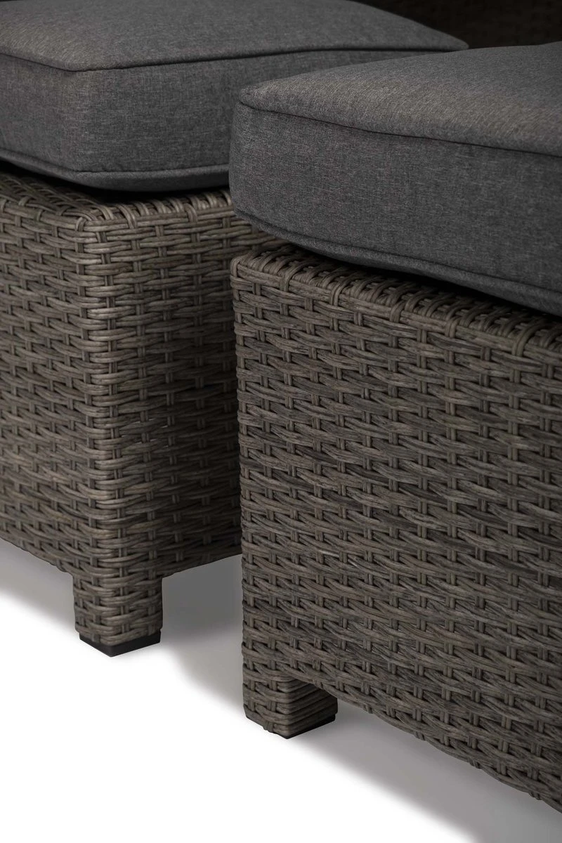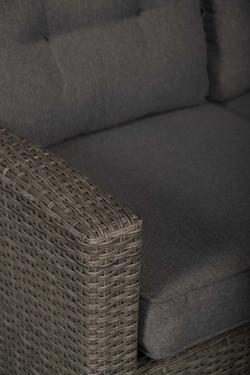 Les pièces de l’ensemble se composent d’un cadre en aluminium, recouvert d’osier plat en plastique de couleur grise, ce qui donne à l’ensemble un look tendance. La table est également dotée d’un cadre en aluminium et est finie avec un plateau en polywood.