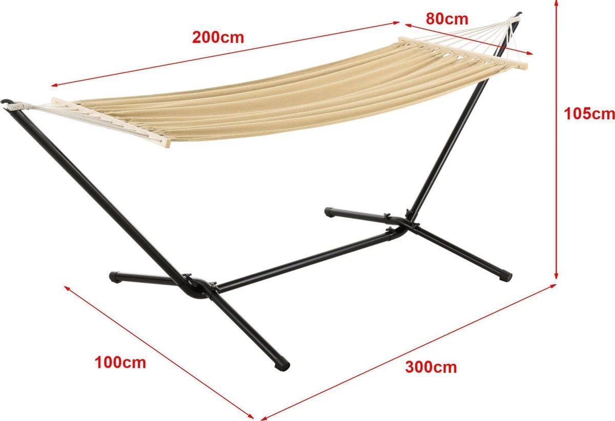 – hamac avec support (longueur x largeur x hauteur) : 300 x 100 x 105 cm