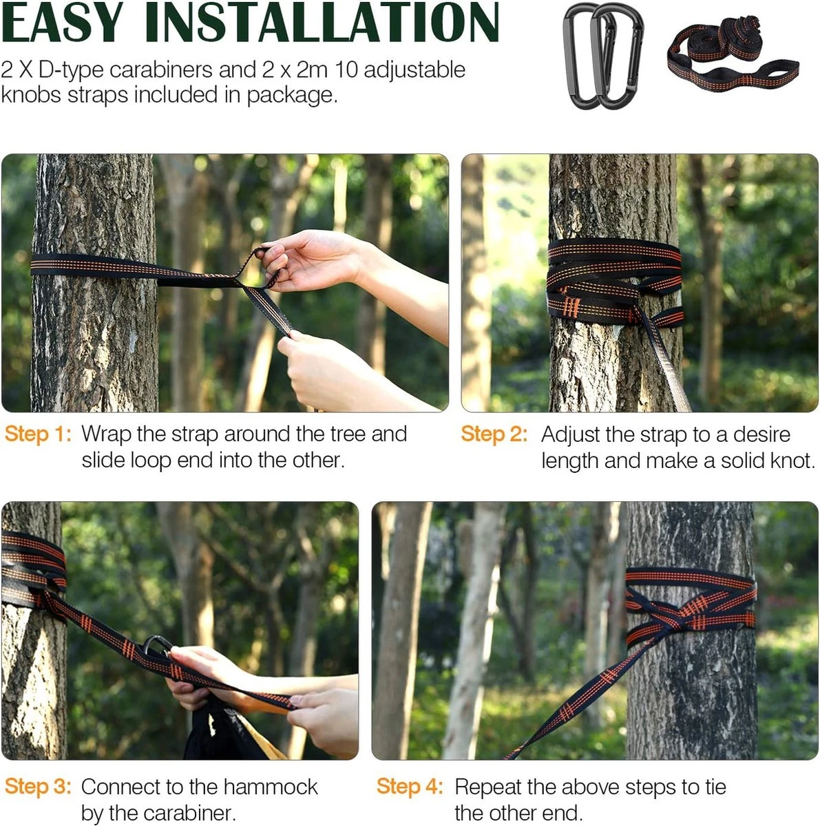 - ACCESSOIRES COMPLETS – Équipé de 2 sangles d’arbre solides, de 2 mousquetons solides, minimise les dommages à l’arbre et empêche l’abrasion de la sangle, fixe solidement le hamac et assure votre sécurité.