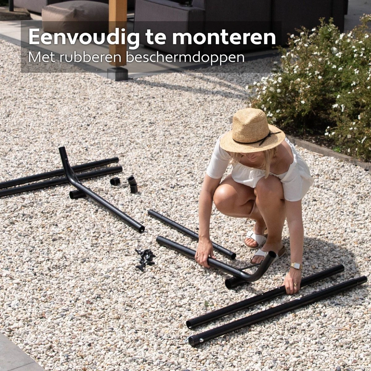 Stable, sûr et attrayant. Le support de ce hamac est fait d’un tube d’acier peint par poudrage. Le support de hamac résiste aux intempéries et les housses de protection (incluses) protègent votre sol des rayures. Il peut être monté facilement et sans outils. En raison de son faible poids, il est facile à déplacer.