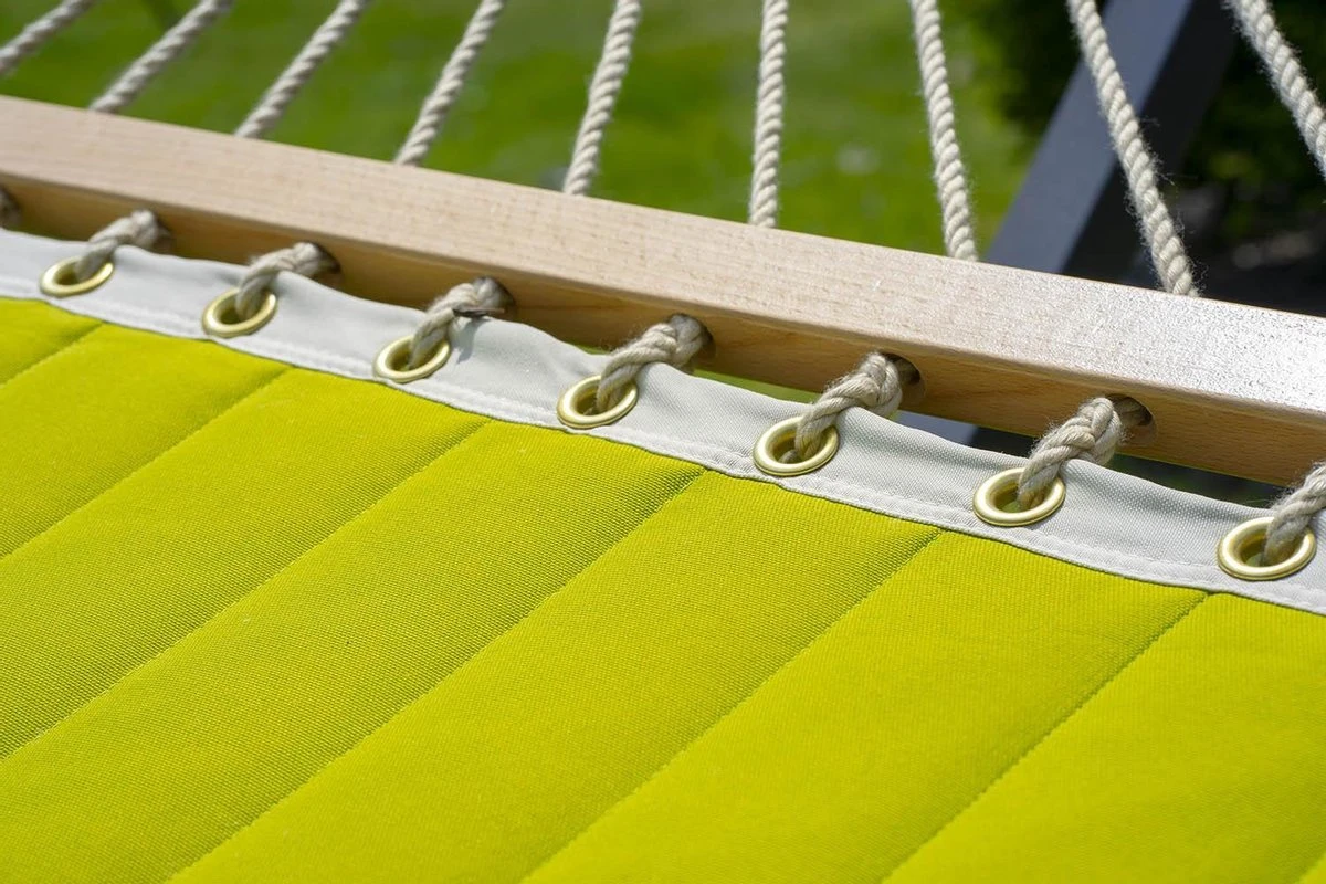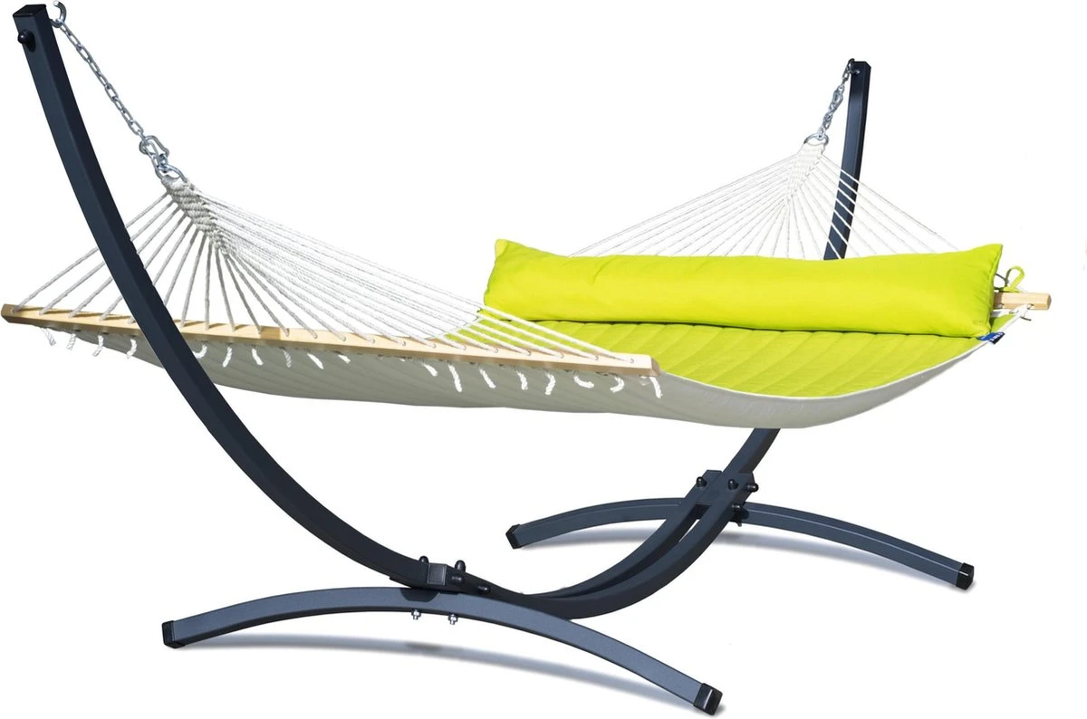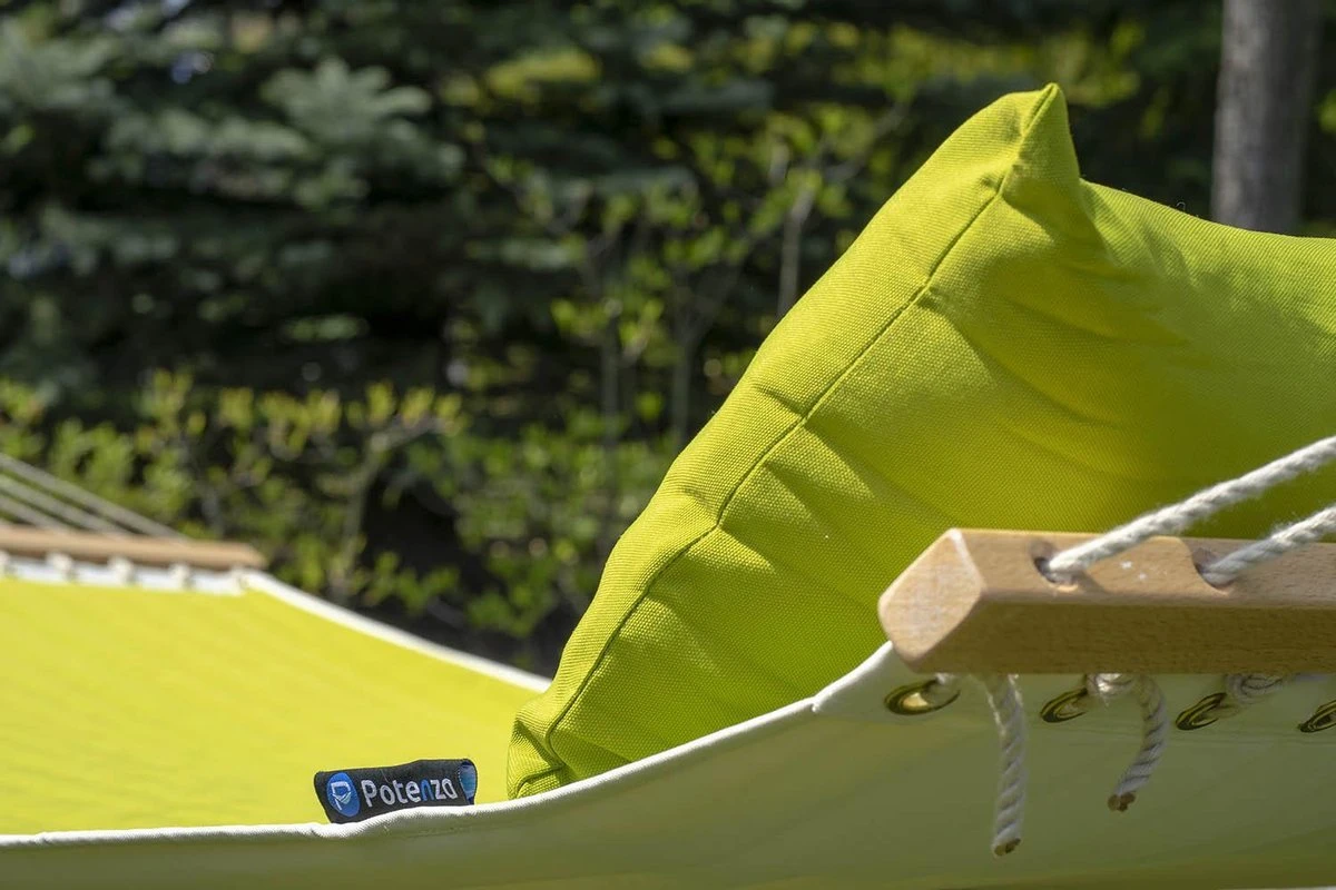 Le hamac king-size de Potenza est très confortable grâce à l’ kussen intégré et au plan de couchage rembourré. La barre d’écartement permet de s’allonger plus facilement sur le hamac.
