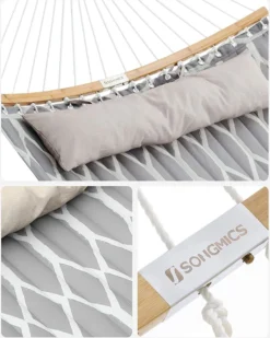- Contenu de la livraison : le colis comprend un hamac (270 x 140 cm), 2 cordes (3 m/pièce), 2 mousquetons fixes en acier, 2 couvre-cordes, 1 manuel d’instructions (peut ne pas être disponible en anglais). –