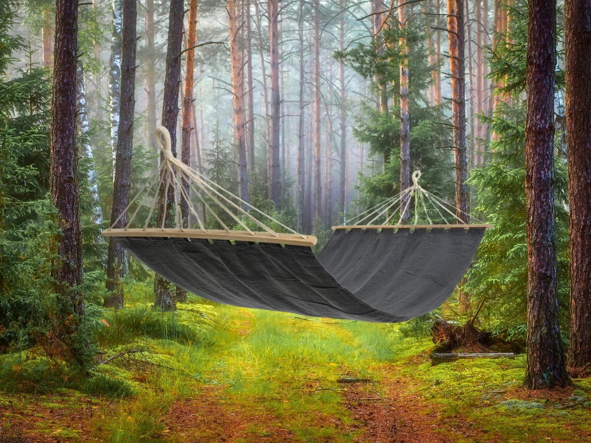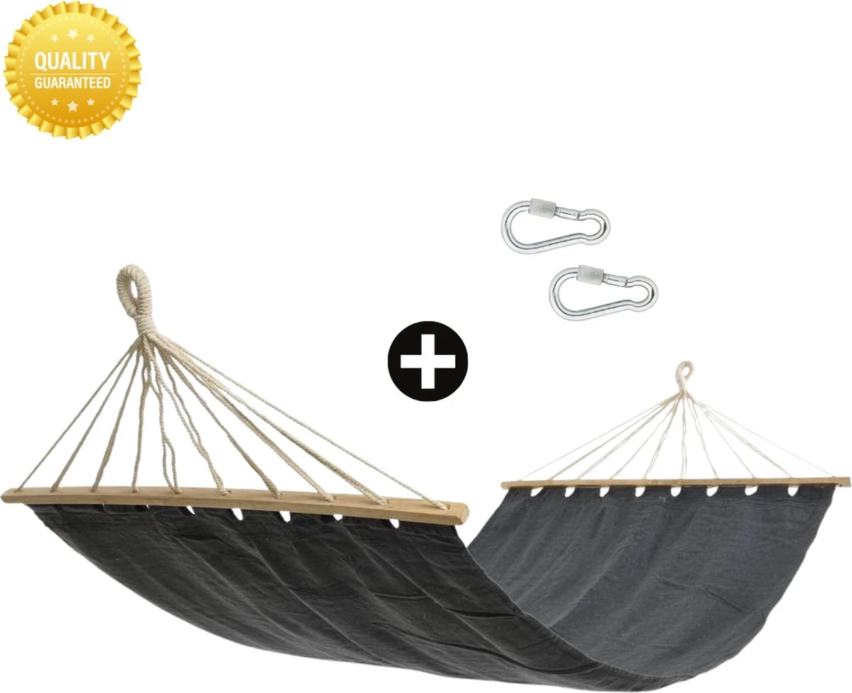 La barre d’écartement empêchera le hamac de se replier complètement. Cela vous permet de vous déplacer librement et vous n’êtes pas « piégé » dans le hamac. De plus, le hamac est également livré avec deux mousquetons. De cette façon, vous pouvez facilement attacher le hamac à un autre crochet ou œillet. Par exemple, le hamac peut être suspendu entre deux arbres, mais il convient également pour un support de hamac. Le hamac a une capacité de charge de 120 kg. De plus, le hamac est en coton.