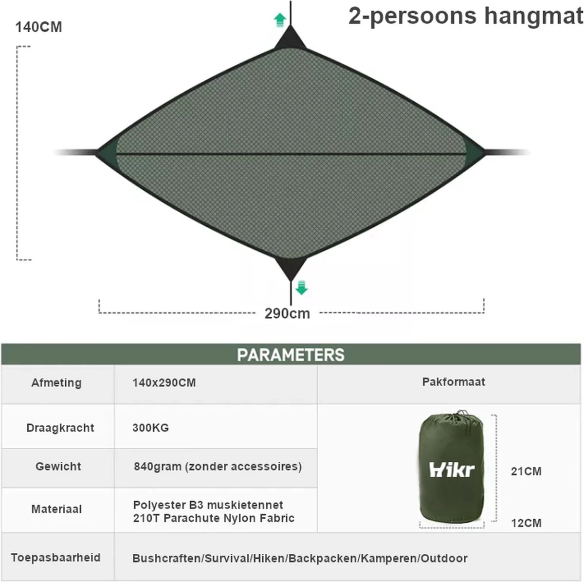 Ce hamac de survie de Hikr est fabriqué dans un matériau de haute qualité (210T Parachute Nylon). Cela rend ce hamac extrêmement solide (capacité de charge de 300 kg) et durable pendant toutes vos aventures en outdoor . De plus, il est ultra léger (seulement 840 grammes !) La taille compacte du sac vous permet de transporter facilement ce hamac avec vous. De plus, ce hamac est équipé d’une moustiquaire, ce qui garantit que vous n’êtes pas incommodé par les insectes. Extrêmement adapté au bushcraft ou à un voyage de survie ! Le hamac peut également être utilisé sans moustiquaire, si vous le souhaitez.