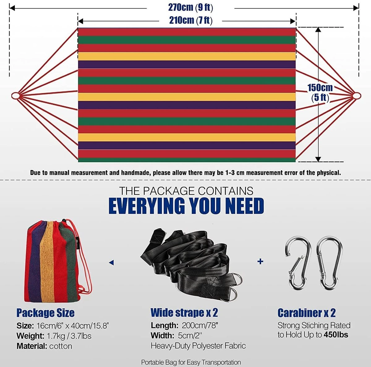 - Portable : Les dimensions : 270 cm de long x 150 cm de large, taille du lit : 210 cm x 150 cm. Le hamac comprend un sac de transport gratuit pour un voyage facile. Il se plie dans une taille compacte et possède son eigen cordon de serrage, vous pouvez donc l’emporter n’importe où.