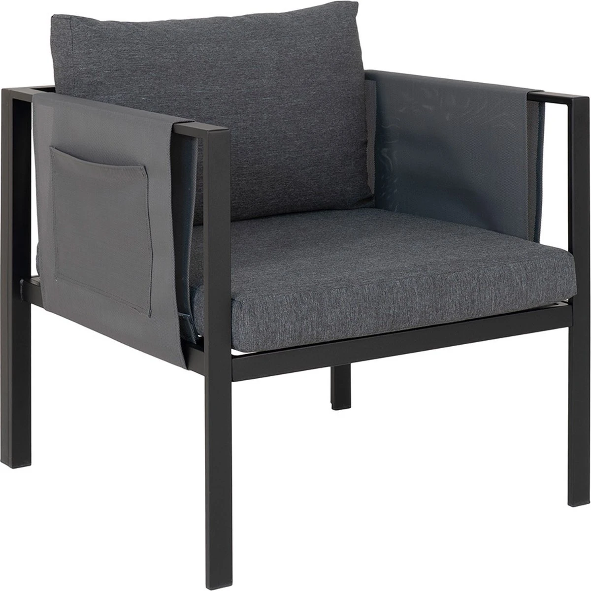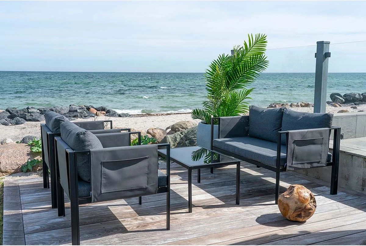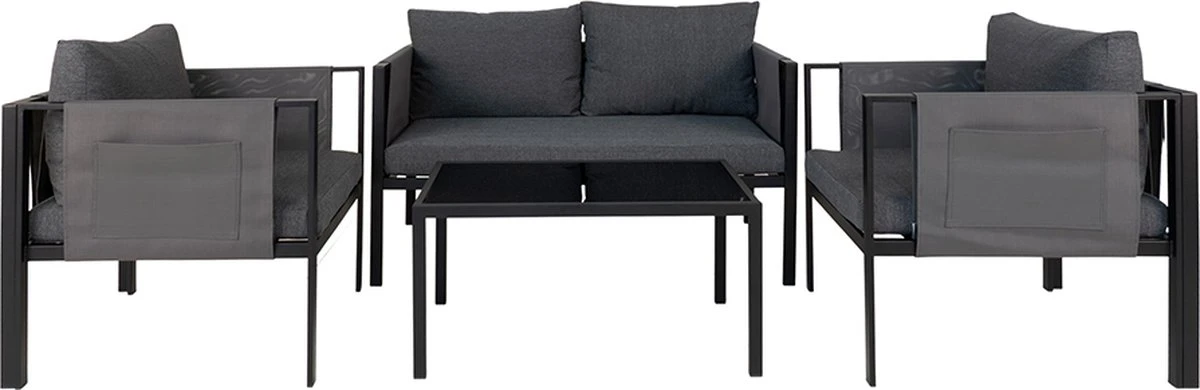 L’ensemble de jardin Markus est un ensemble de jardin 4 pièces en acier, verre et polyester. L’ensemble de salon se compose d’un canapé, de deux fauteuils et d’une table basse.