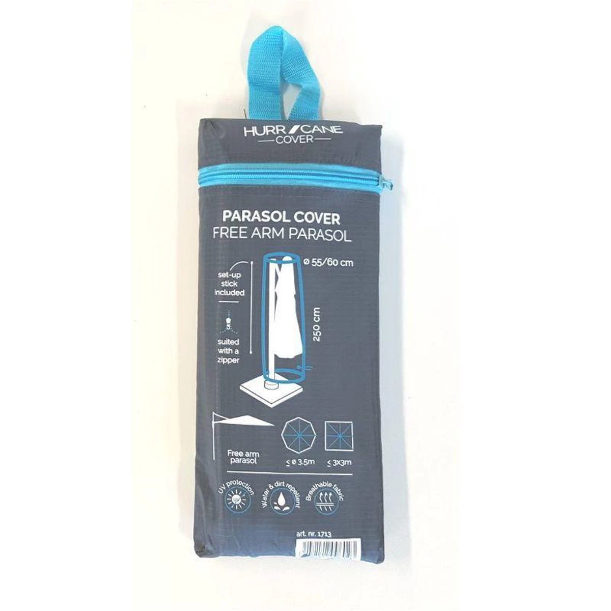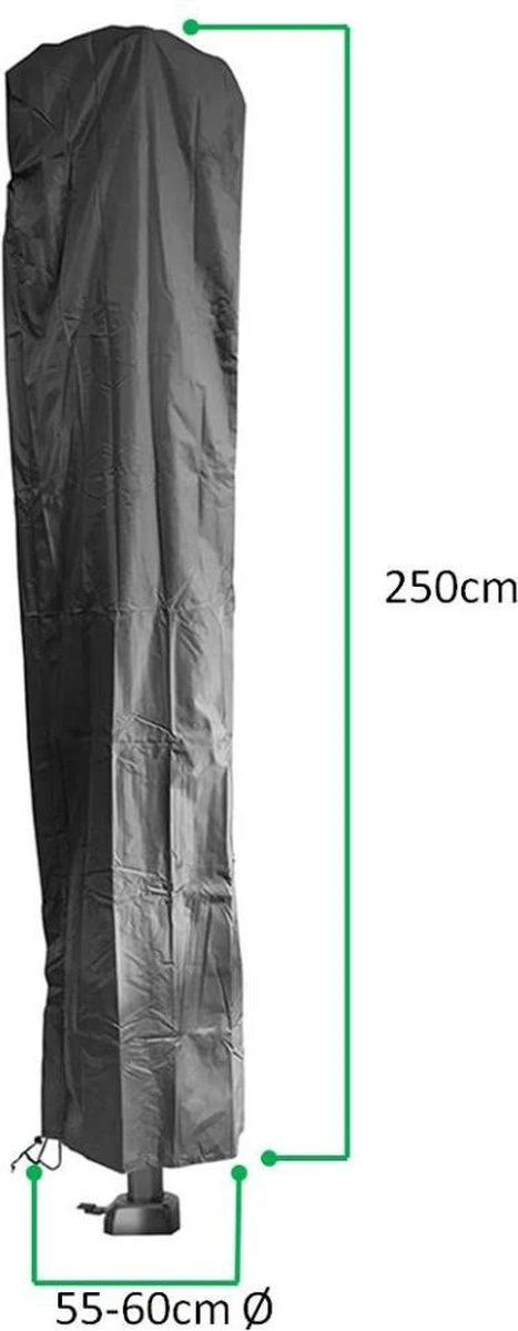 Cette housse de parasol mesure 250 cm de long et 55 à 60 cm de large. Il s’élargit vers le bas. La housse convient aux parasols suspendus dans les tailles: