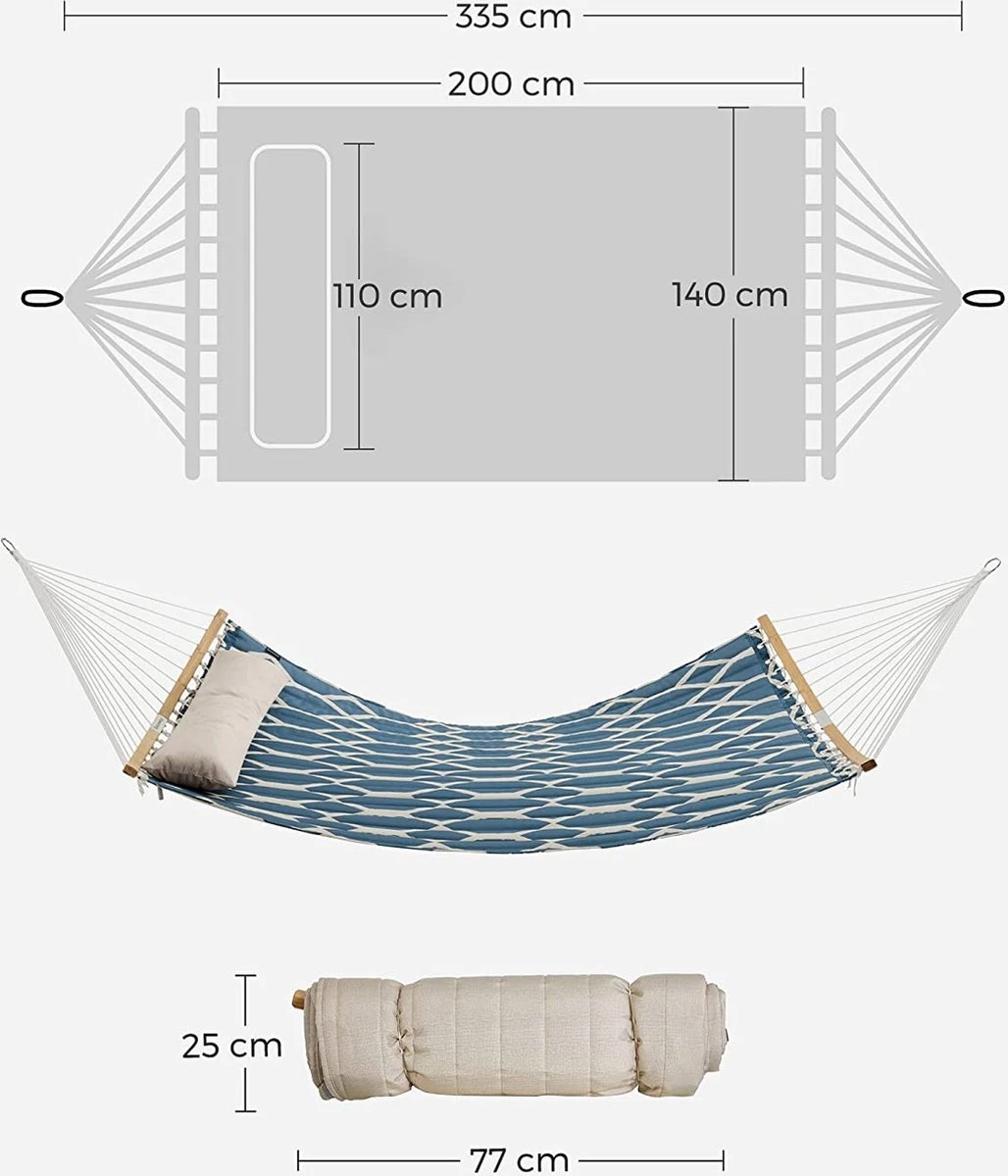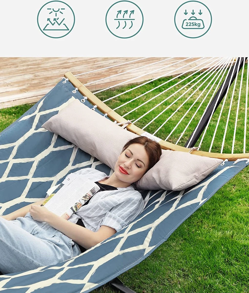 - Une journée farniente : allongez-vous dans ce hamac (200 x 140 cm), posez votre tête sur l’ kussen, étirez vos bras et vos jambes. Le temps de se détendre. Le hamac est doublé d’un rembourrage en polyester, ce qui augmente encore le confort de couchage