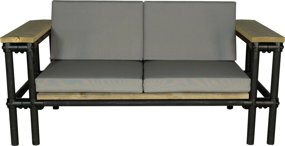 Meubles D’ Outside | Banc De Jardin échafaudage Bois Et Tube D’échafaudage Noir Mat | Canapé Double | Ancien Look | Oreillers Gris | Banc De Jardin | Mobilier De Jardin