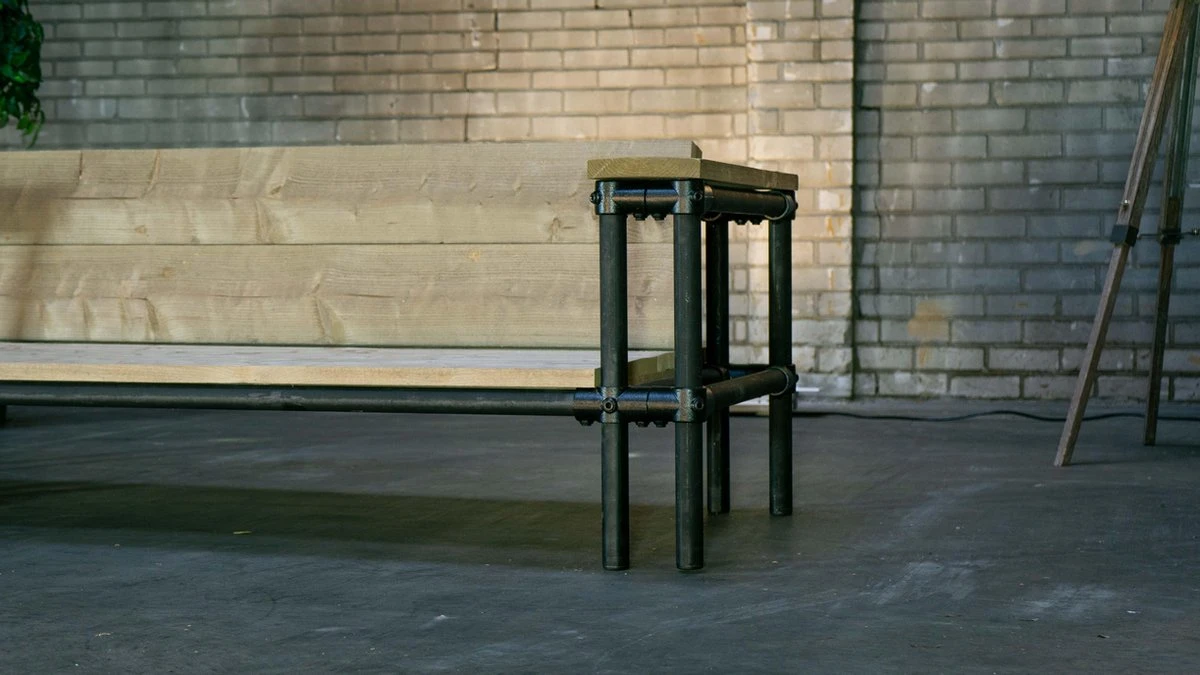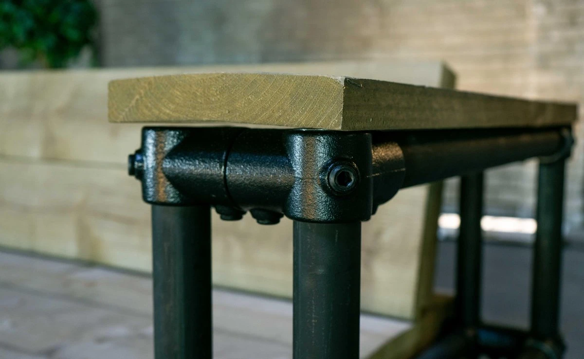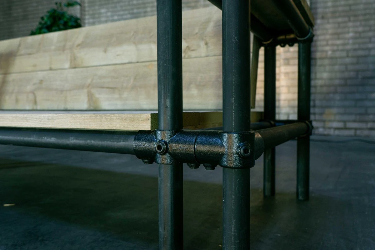 Spécifications du banc industriel double: (LxlxH) 156 x 66 x 78 cm Profondeur d’assise 60 cm avec tubes galvanisés noir mat de 42,2 mm