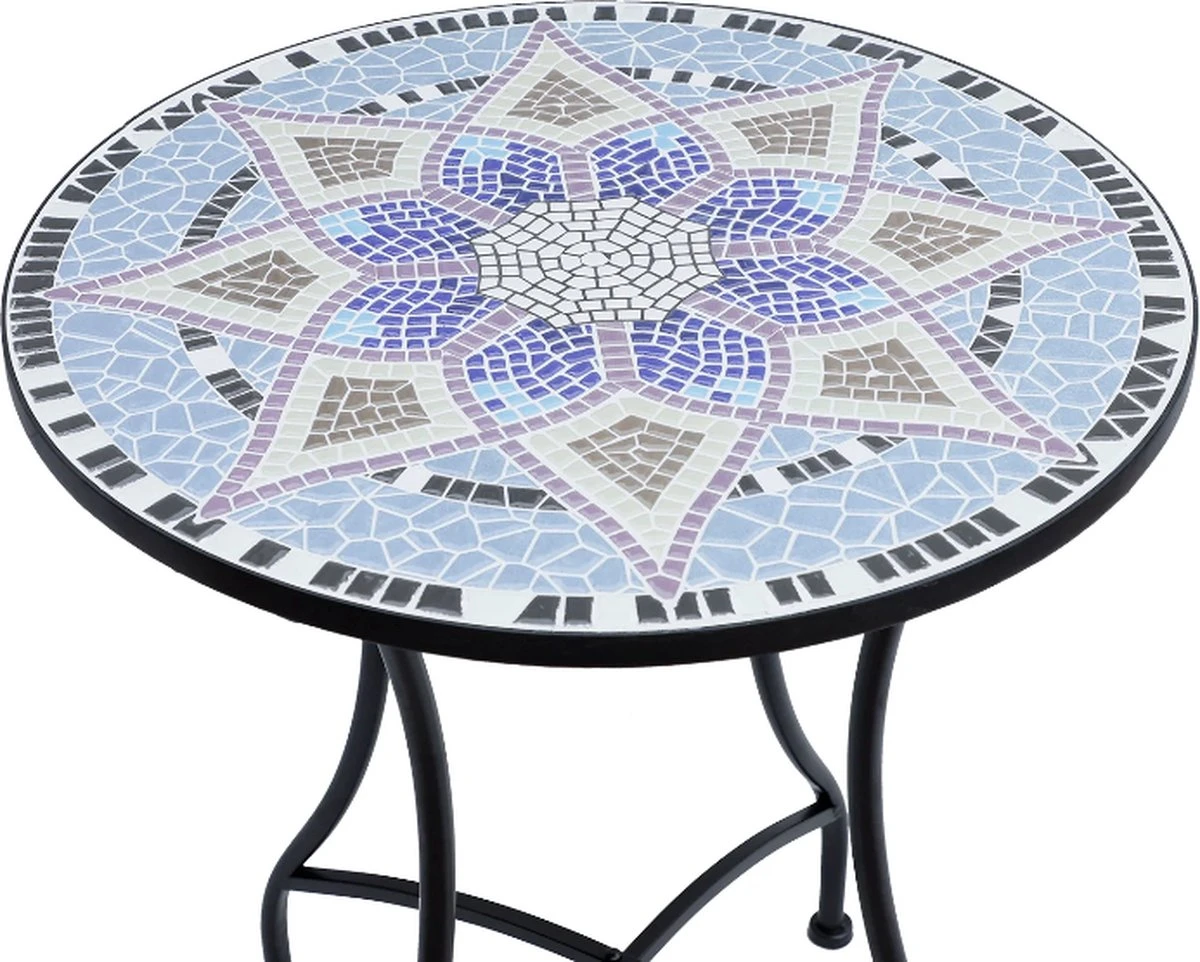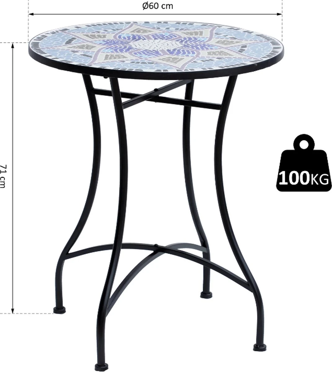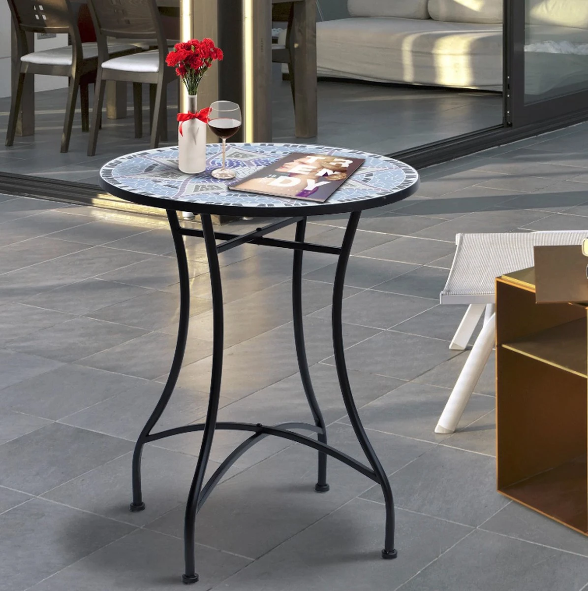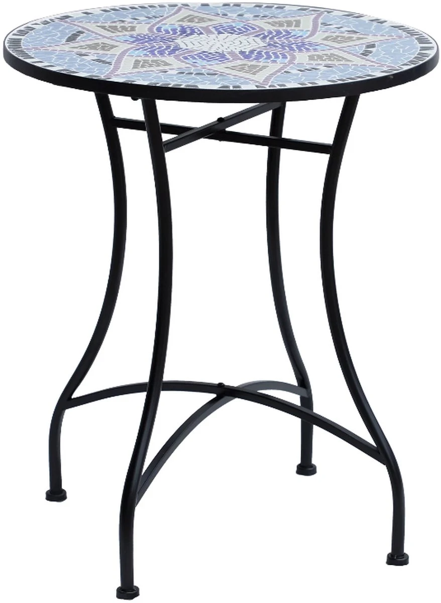 Design: La mosaïque bleu-blanc clair et le cadre élégamment incurvé font de cette table de jardin ronde robuste la plus belle nouveauté de votre espace extérieur.