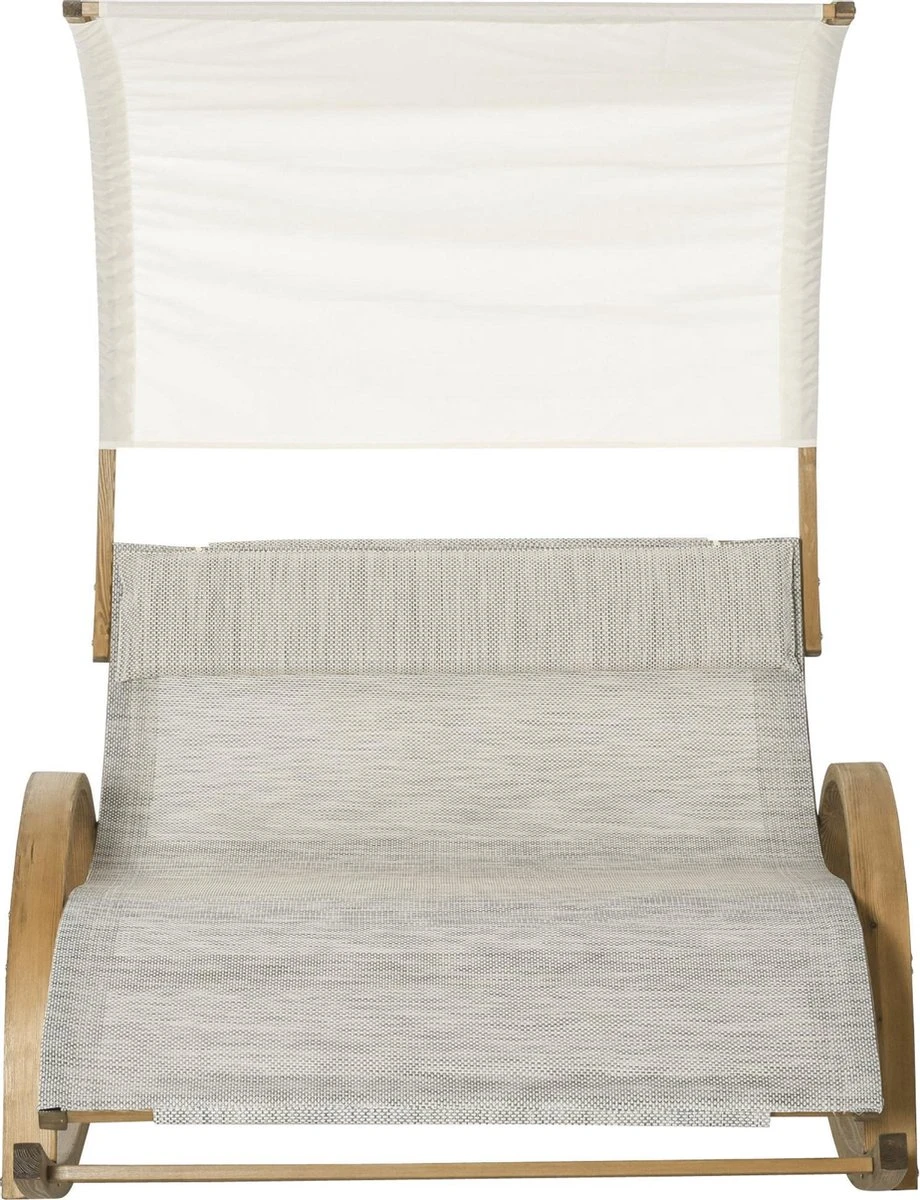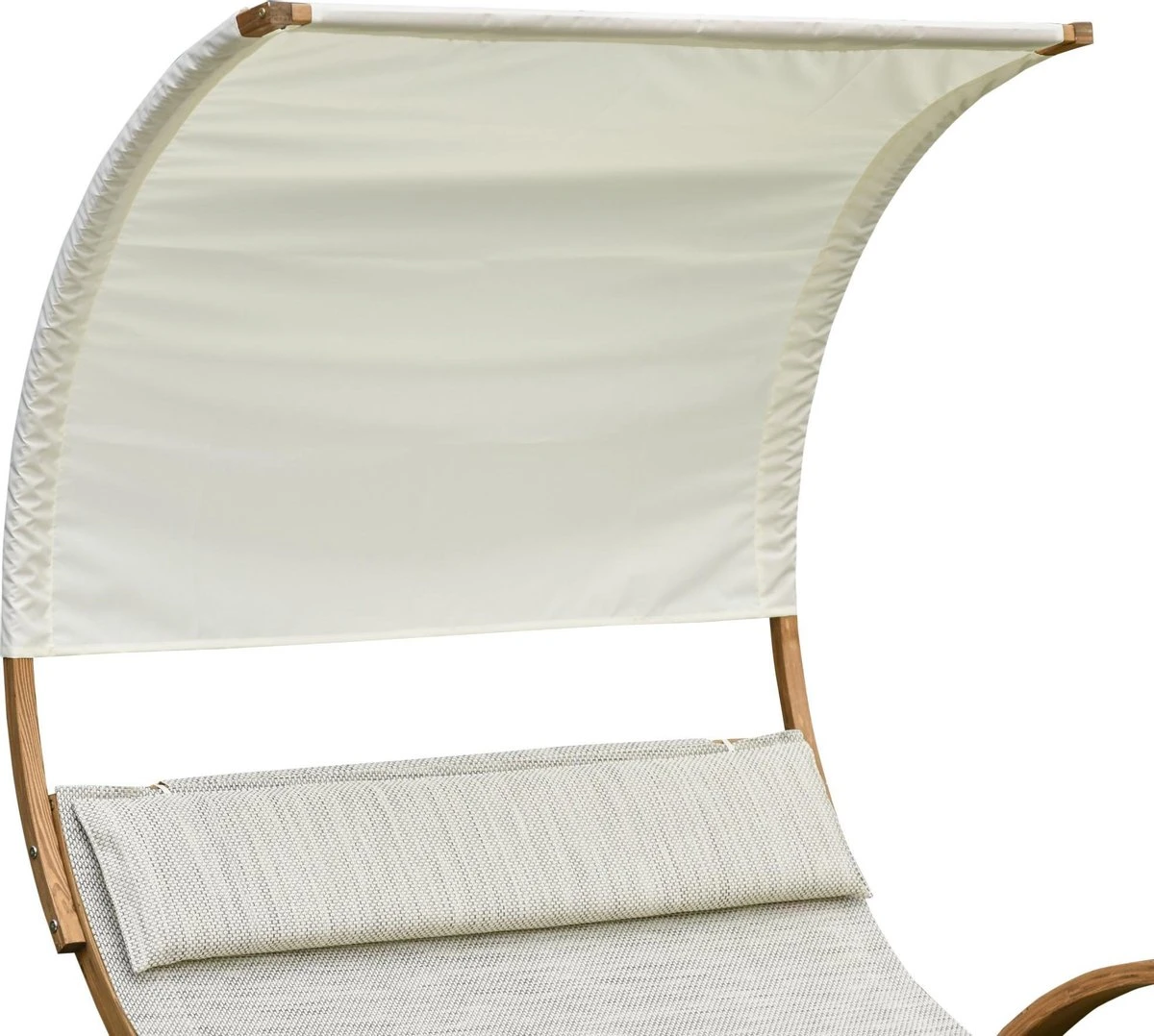 – Couleur : gris + blanc – Matière : bois de mélèze massif, maille respirante, 100% polyester – Dimensions hors tout : 190L x 135W x 185H cm – Hauteur d’assise : 50 cm – Dimensions kussen: 115L x 25W x 6H cm – Capacité de charge : 180 kg – Dimensions pare-soleil : 174L x 120H cm – Étiquette de l’article : 84B-543