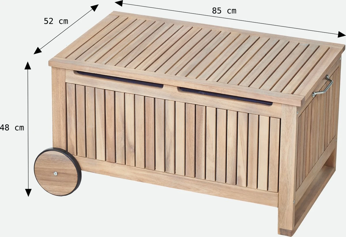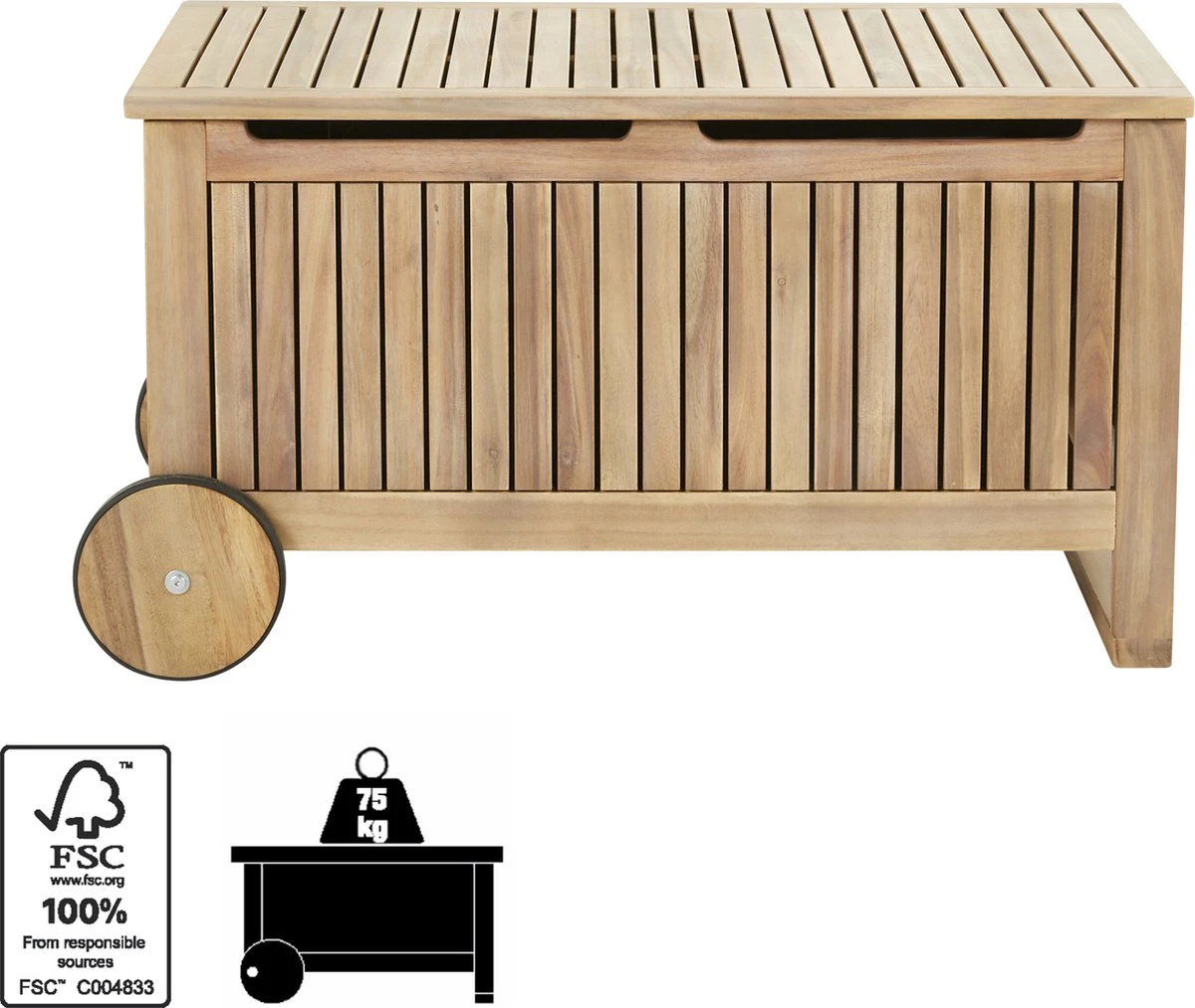 - DESIGN : Ce coffre de jardin sur roulettes avec 118 litres d’espace de rangement est la solution de rangement idéale pour les tissus d’ameublement, les outils et les décorations de jardin. Il est fabriqué en bois d’acacia, ce qui donne au coffre un charme authentique et naturel, ce qui le rend facile à adapter à n’importe quel environnement.