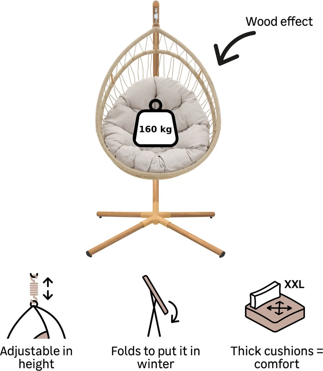 - CONFORTABLE : Le siège en forme de panier offre un soutien optimal et le kussen moelleux assure un grand confort. Les pieds en acier assurent la stabilité et la chaîne flexible permet de régler le fauteuil individuellement en hauteur. Grâce à la suspension, vous ressentez de la légèreté dans votre cocon et vous retrouvez rapidement la relaxation grâce à un doux balancement.