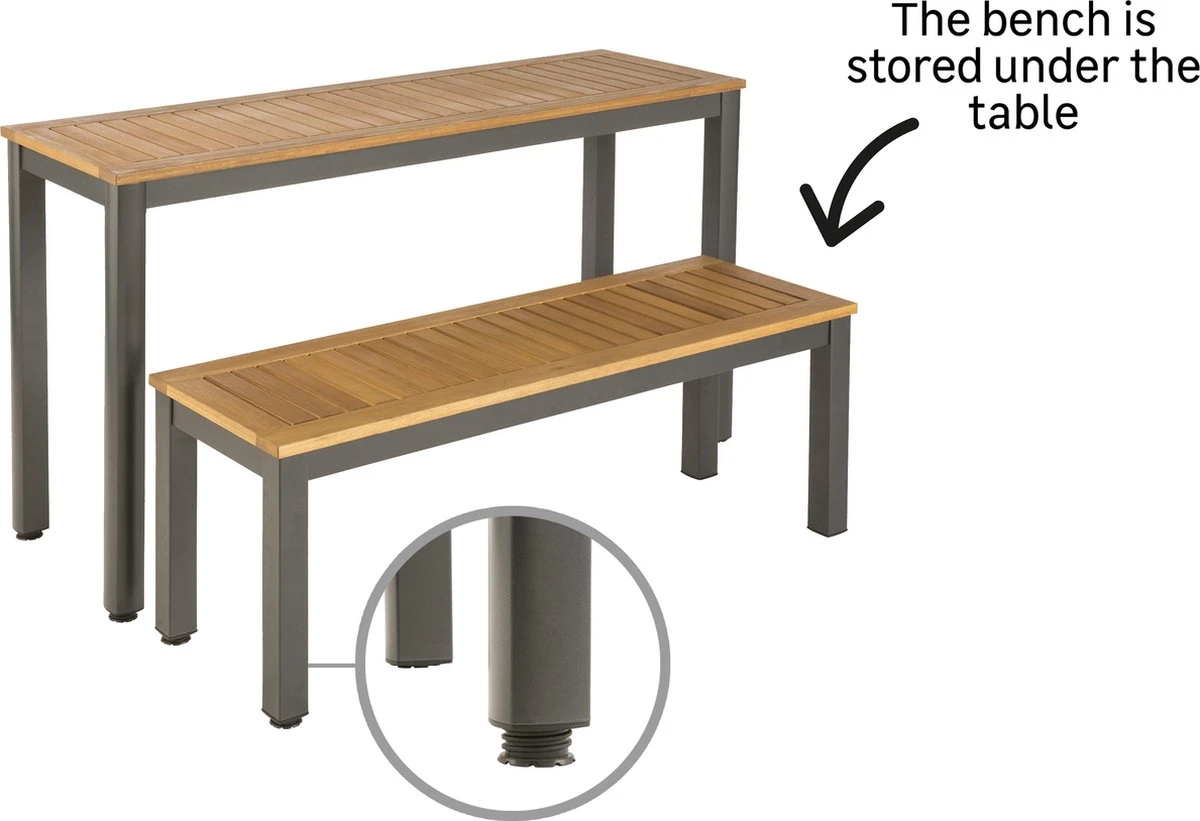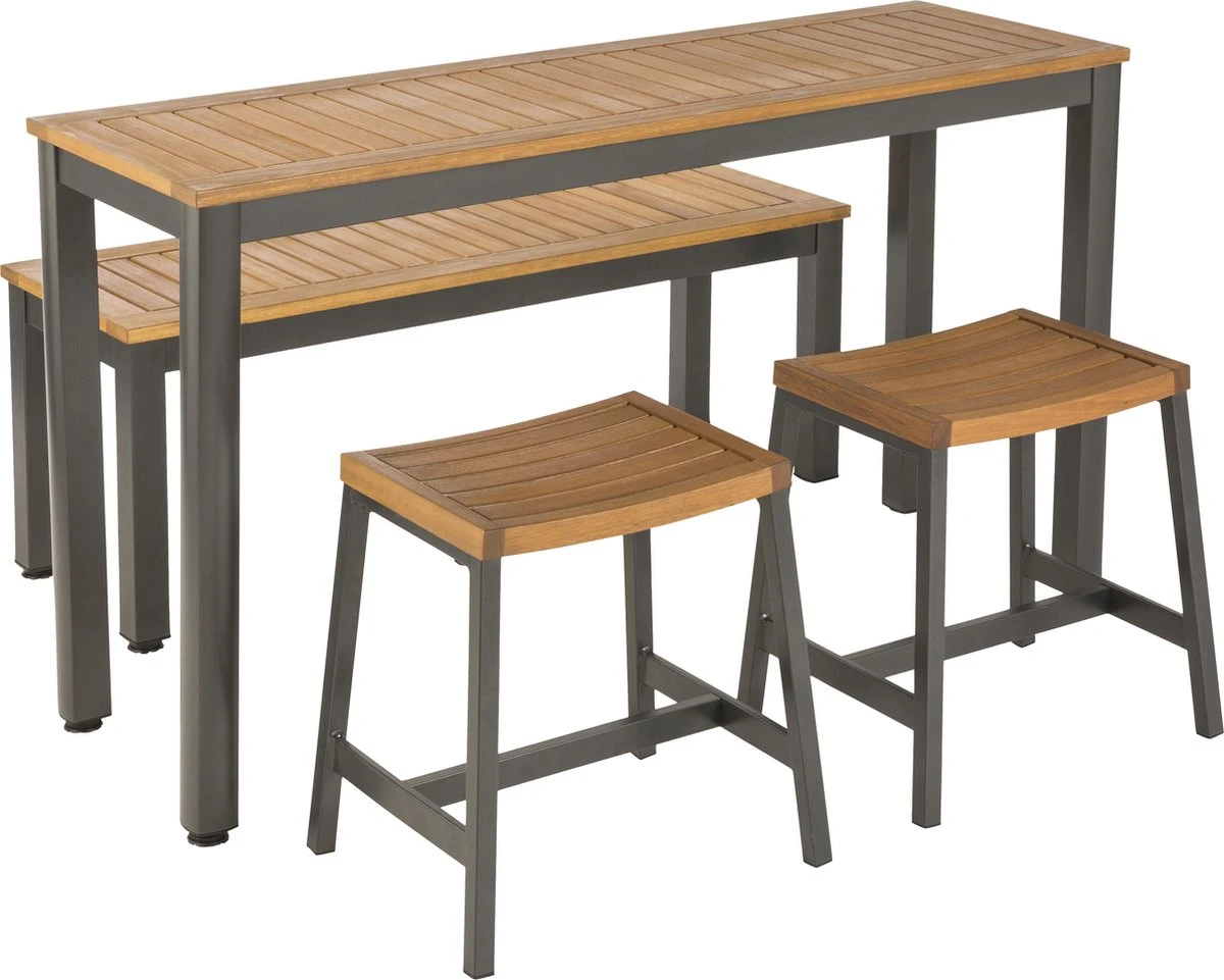 Les meubles de jardin de la sĂ©rie ORIS offrent un joli jeu de bois et d’aluminium gris foncĂ©. Cet ensemble de deux tabourets, un banc et une table est tout aussi Ă©lĂ©gant. Que ce soit pour un petit-dĂ©jeuner dĂ©contractĂ©, un goĂ»ter ou une bière spontanĂ©e après le travail : cet ensemble de salle Ă manger ORIS avec une table, un canapĂ© deux places et deux tabourets est l’Ă©quipement idĂ©al Ă tout moment de la journĂ©e – grâce Ă ses dimensions peu encombrantes , mĂŞme lĂ oĂą peu d’espace est disponible. L’ensemble surĂ©levĂ© dĂ©gage le flair des bars en plein air. S’asseoir sur le canapĂ© et les tabourets lĂ©gèrement incurvĂ©s est extrĂŞmement confortable. Alors que les cadres des meubles sont en aluminium lĂ©ger et robuste, rĂ©sistant Ă l’humiditĂ© et Ă la rouille, les sièges et le plateau de la table sont en bois d’eucalyptus. Avec les formes anguleuses et le contraste entre le cadre de couleur anthracite et le bois chaleureux, le salon de jardin ORIS correspond au style industriel tendance.