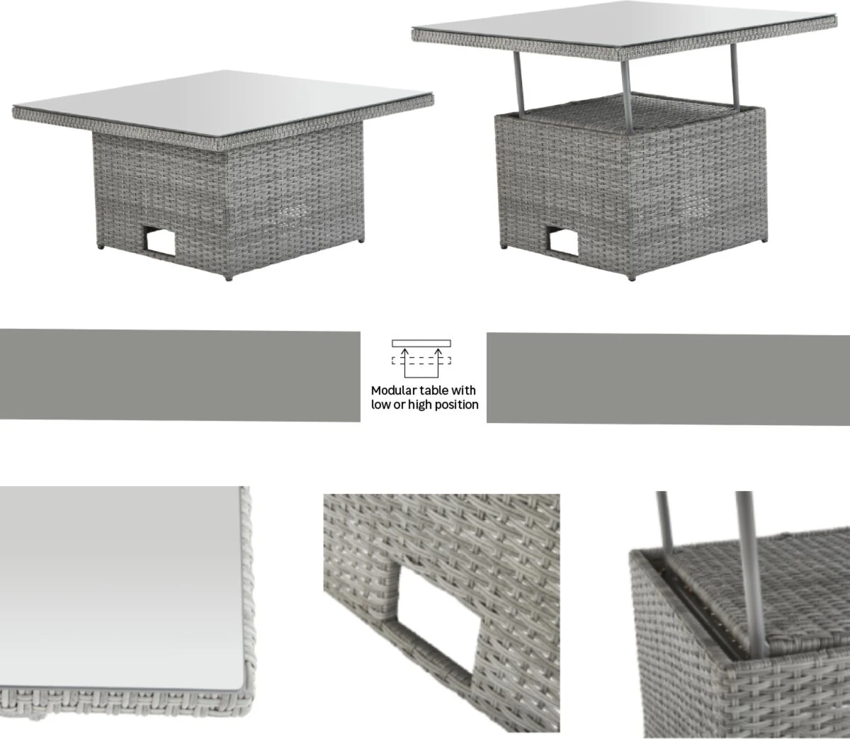 - DESIGN : Les finitions en rotin synthétique s’accordent parfaitement aux différents oreillers et offrent un style décontracté et confortable. Le plateau en verre donne à la table une touche moderne tout en conservant son charme authentique.