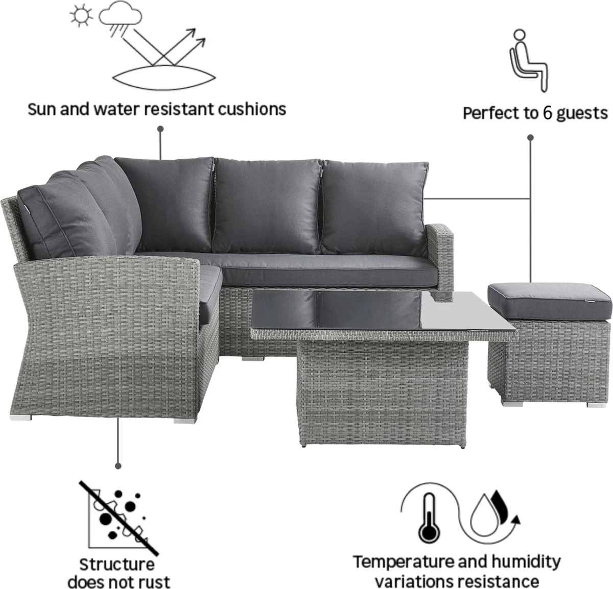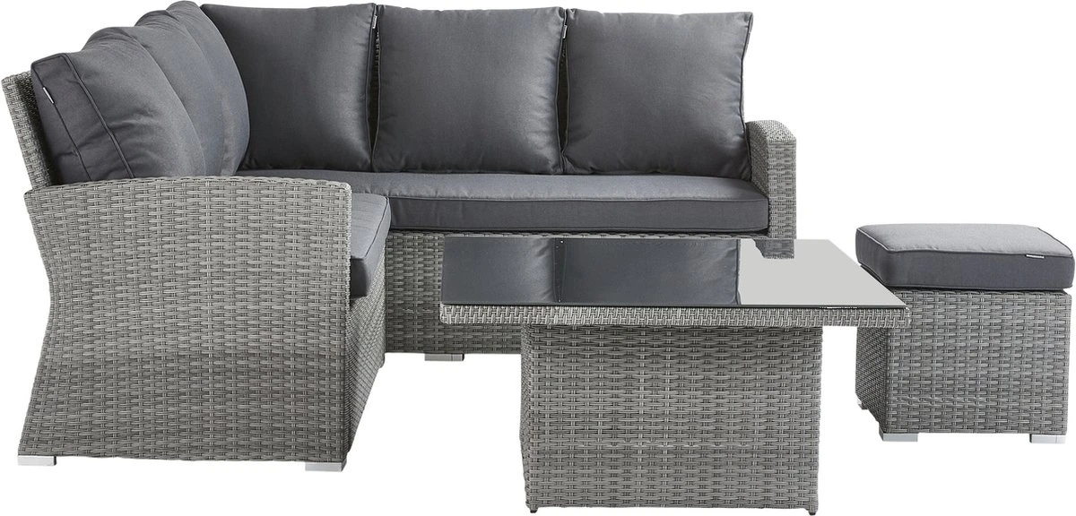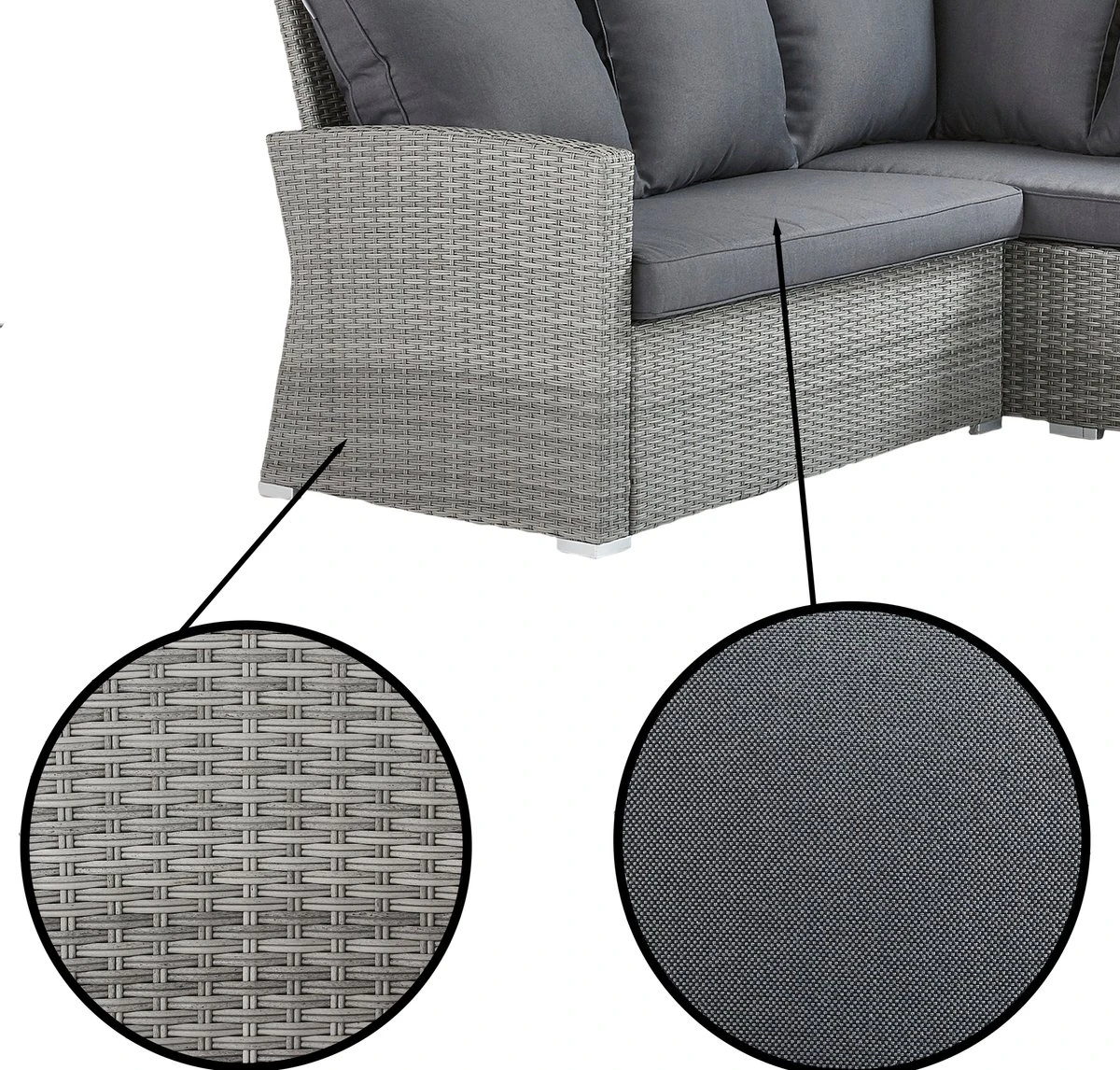 - CONFORTABLE : Ce salon de jardin se compose d’un canapé d’angle spacieux et d’un tabouret, chacun équipé de coussins d’assise et de coussins de dossier pour vous offrir un confort optimal. Idéal pour passer de belles journées et soirées en famille et entre amis.