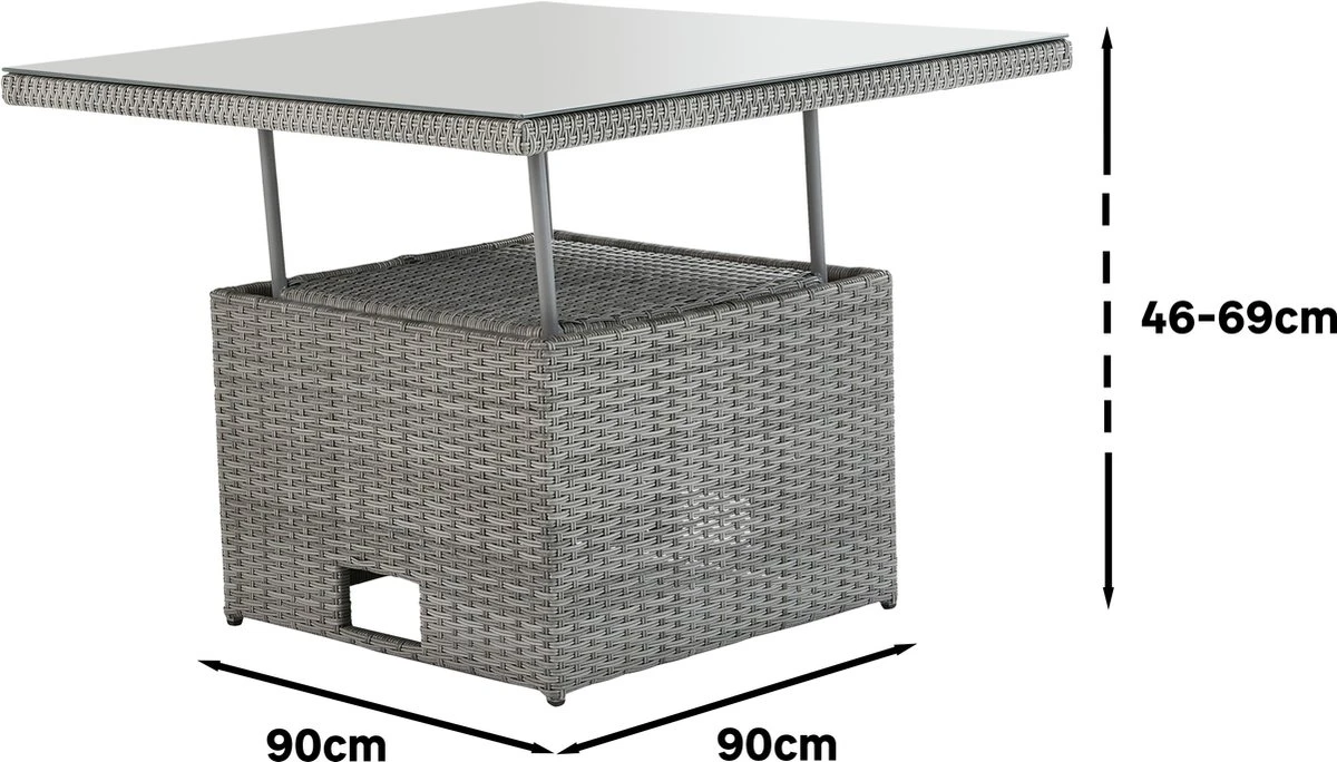 - COMPOSITION : Cet ensemble de salon de jardin DAVOS se compose d’un canapé d’angle avec coussins d’assise et de dossier, d’un tabouret avec coussins d’assise et d’une table basse pliante mesurant 90x90x46-69 cm. Les coussins sont résistants aux UV et à l’eau et peuvent être retirés.