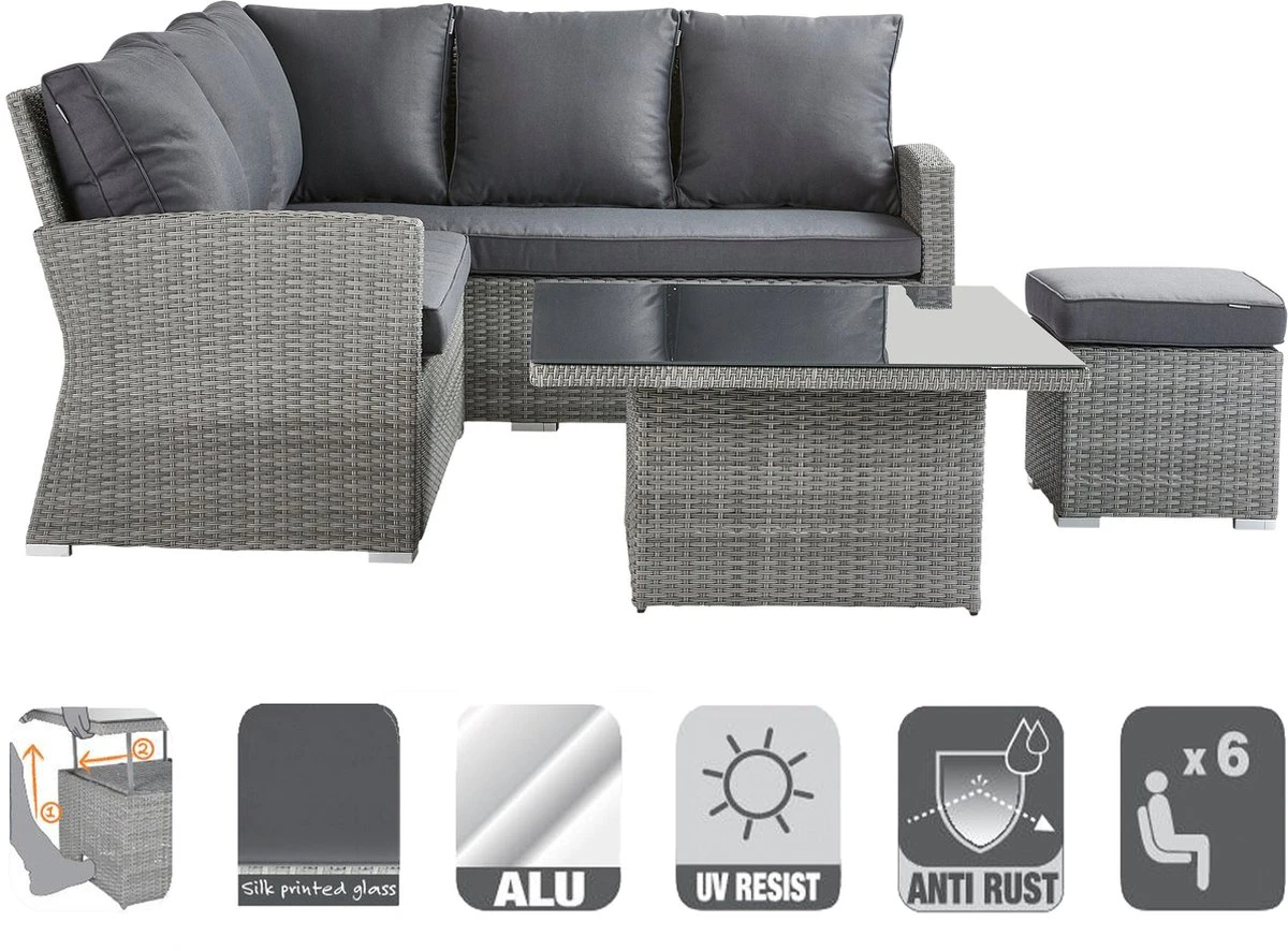Le salon d’angle Davos peut accueillir jusqu’à 6 personnes et se prête aussi bien à un repas décontracté qu’à un moment rafraîchissant sur le grand canapé d’angle confortable. Il est idéal pour se détendre entre amis lors des beaux jours, mais aussi pour passer de belles soirées. Cet ensemble de jardin DAVOS se compose d’un canapé d’angle pour 5 personnes, d’un tabouret et d’une table basse. La table du groupe de sièges Davos est polyvalente et peut être utilisée comme table basse ou table de bar. Transformez en un rien de temps un apéritif en un repas convivial en famille ou entre amis. Le plateau de la table est recouvert de verre, ce qui est non seulement esthétique, mais aussi très facile à nettoyer. Les coussins d’assise et de dossier sont déhoussables, offrent un haut niveau de confort et procurent des moments de détente. Descriptif détaillé du salon de jardin DAVOS : 1 canapé d’angle, 1 tabouret, 1 table basse, 3 coussins d’assise (2 pour le canapé, 1 pour le tabouret), 6 coussins de dossier pour le canapé.