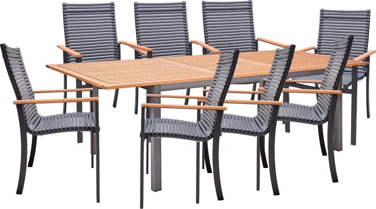 - DESIGN : Avec son design simple, ce salon de jardin s’adapte à vos différents styles. Le cadre en aluminium moderne est adouci par le plateau et les accoudoirs en bois d’eucalyptus, qui donnent un aspect plus naturel. Les chaises combinent des lignes droites avec des formes arrondies pour obtenir un design contemporain.