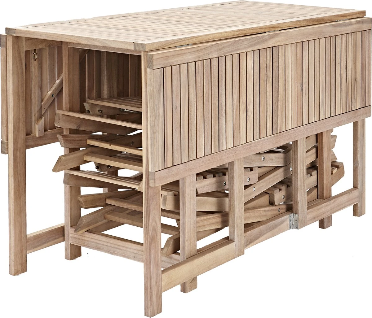 Le salon de jardin compact SOLIS est idéal pour les petits espaces et vous permet de profiter de votre temps à l’extérieur. Il se compose d’une table 120 x 120 cm et de 4 chaises et est donc idéal pour 4 personnes. Le bois d’acacia donne à la table une touche de charme naturel tout en étant à la fois design et résistant. L’huile de finition donne au bois son aspect blond naturel. Grâce à sa conception pliante, la chaise est facile à ranger lorsqu’elle n’est pas utilisée et est idéale pour s’asseoir dehors et profiter du beau temps. Faites simplement glisser les chaises sous le centre de la table et rabattez les côtés de la table. Une fois plié, l’ensemble n’occupe que 50 x 120 cm.