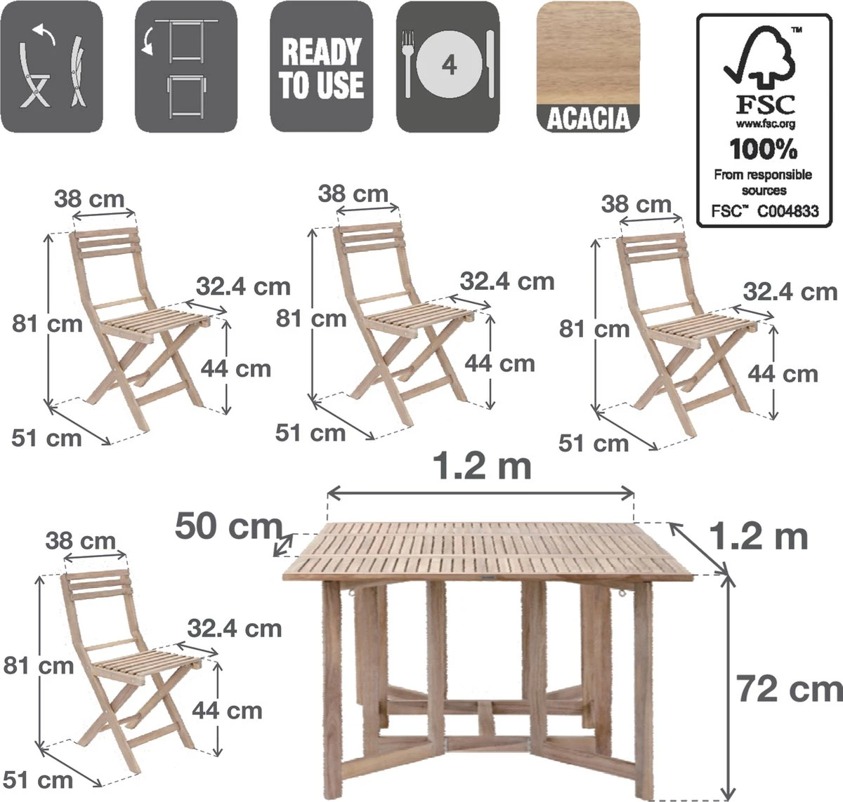 - Durable : l’acacia est un bois tropical qui est naturellement durable et solide et peut résister à l’extérieur. Les chaises peuvent supporter un poids allant jusqu’à 160 kg, la table – 75 kg. La quincaillerie de ces produits est en acier galvanisé pour assurer durabilité et durabilité en extérieur.