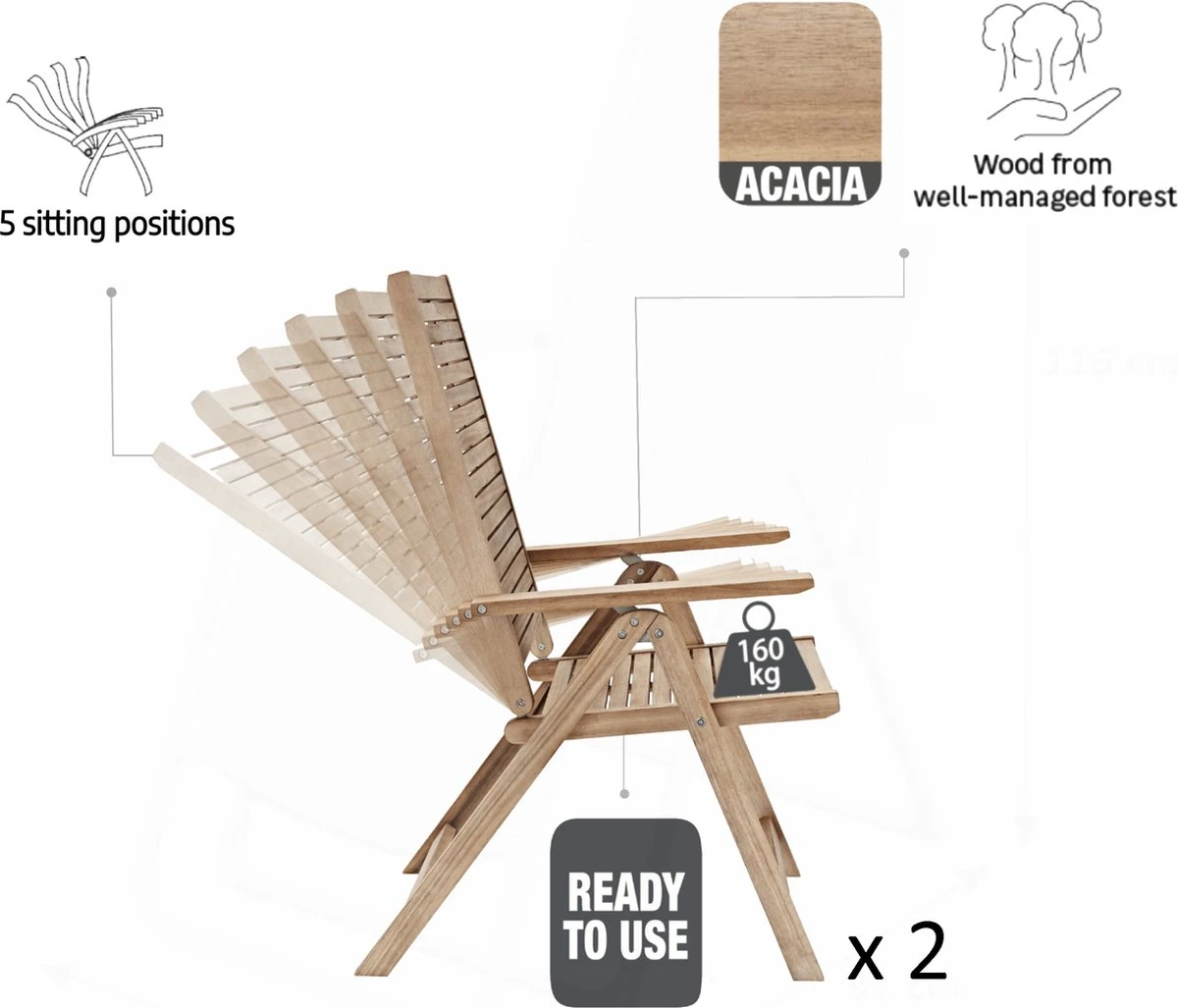 - CONFORTABLE : Grâce au dossier réglable en cinq positions différentes, ces chaises de jardin offrent une position assise agréable et confortable. Idéales pour manger mais aussi pour lire, elles vous accompagneront dans vos moments de détente.