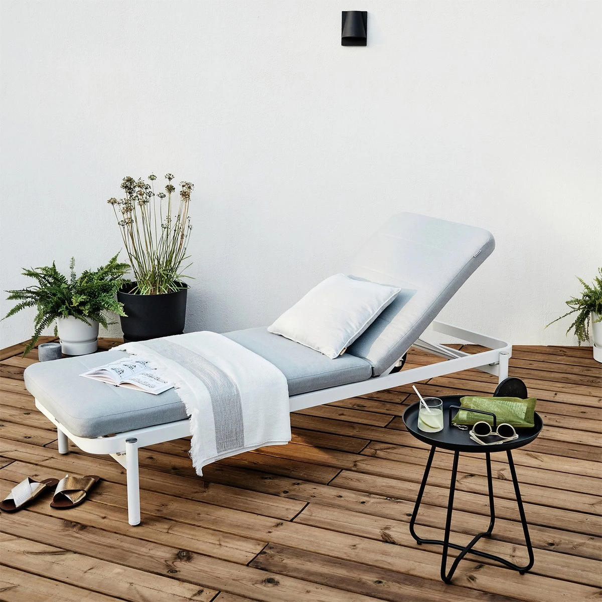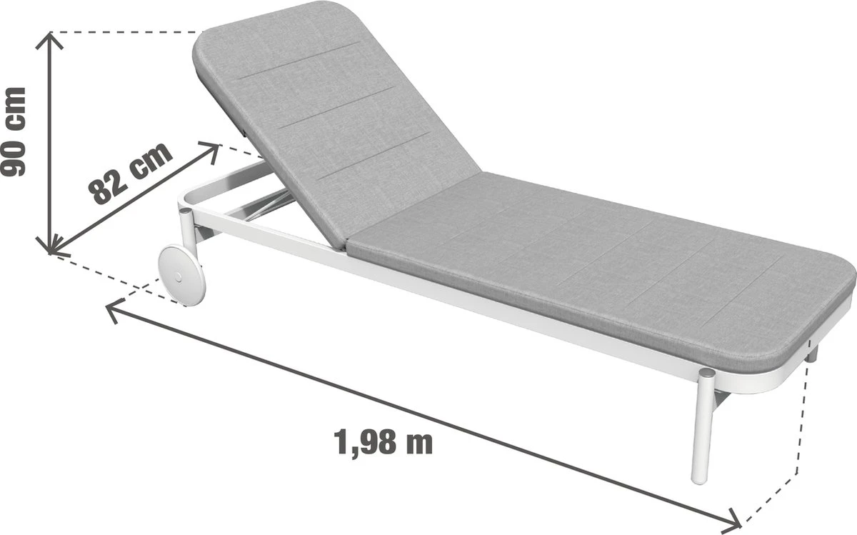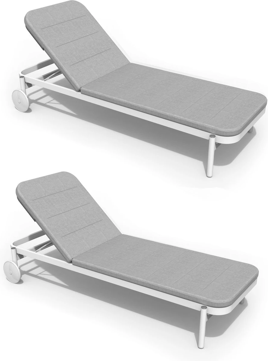 Ces deux chaises longues ARENA sont idéales pour lire, se détendre et se reposer à l’extérieur, car leurs dossiers peuvent être inclinés dans cinq positions différentes. Grâce à leurs deux roues et leur faible poids, ils sont faciles à déplacer et peuvent vous suivre ainsi que le soleil pour que vous soyez toujours au meilleur endroit. Le cadre en aluminium blanc assure légèreté, résistance aux intempéries et facilité d’entretien. Les coussins garantissent un confort optimal et s’intègrent parfaitement à la structure pour donner à la chaise longue un style unique et moderne. Il est tout de même conseillé de ramasser son mobilier de jardin en hiver ou de le recouvrir d’une housse adaptée.
