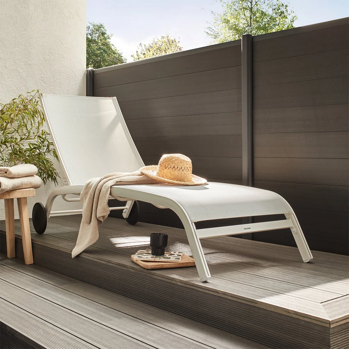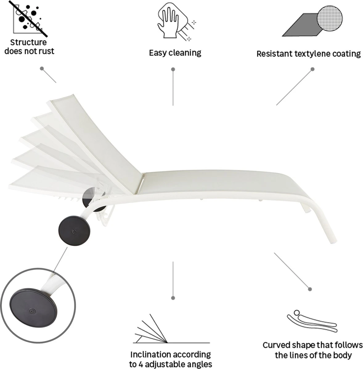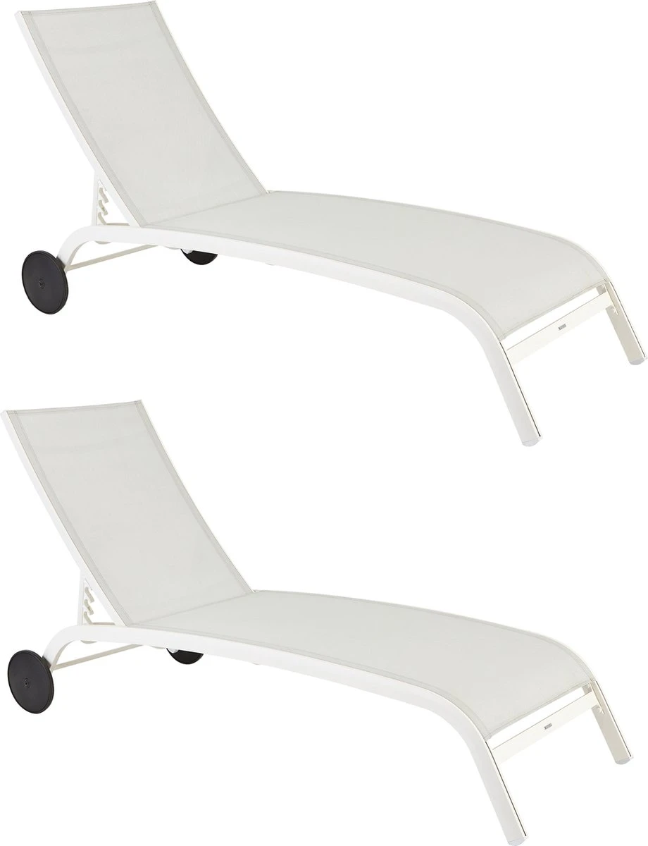 Ces deux chaises longues LYRA II sont idéales pour lire, se détendre et se reposer en plein air grâce à leur dossier inclinable dans quatre positions différentes. Grâce à leurs deux roues et leur structure légère en aluminium, ils sont faciles à déplacer et peuvent vous suivre ainsi que le soleil pour être toujours au meilleur endroit. L’assise et le dossier en textilène vous accueillent confortablement sans négliger la résistance. Le tissu spécial de 2 fils de chaîne et 1 fil de trame assure une ventilation optimale (aéré et résistant). Le tissu Textilène est résistant aux intempéries et facile d’entretien, et la structure en aluminium vous garantit une résistance aux intempéries et à la rouille, même s’il est tout de même conseillé de le protéger des agressions de l’hiver en le recouvrant d’une valise ou de les ranger à l’intérieur pour prolonger leur durée de vie. vie. durée de vie.