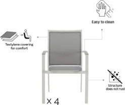 Idéal pour les petits espaces, ce lot de 4 fauteuils de jardin EMYS est conçu pour votre terrasse, jardin ou balcon. Les chaises de jardin sont pliables et peuvent être facilement rangées lorsqu’elles ne sont pas utilisées. Elles sont idéales pour s’asseoir dehors et profiter du beau temps. Ces fauteuils pliants EMYS sont conviviaux et durables grâce à leur structure en acier et leur assise en textilène. Ils sont résistants aux intempéries et peuvent supporter un poids allant jusqu’à 120 kg.