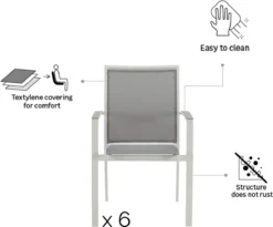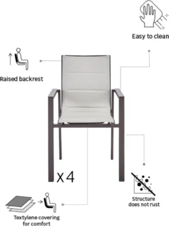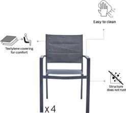 - RÉSISTANT : L’assise en textilène et la structure en acier rendent ces fauteuils de jardin résistants aux intempéries et peuvent supporter un poids allant jusqu’à 120 kg. Ces fauteuils résistants restent confortables avec leurs deux accoudoirs, vous permettant de profiter de votre espace extérieur en toute simplicité.