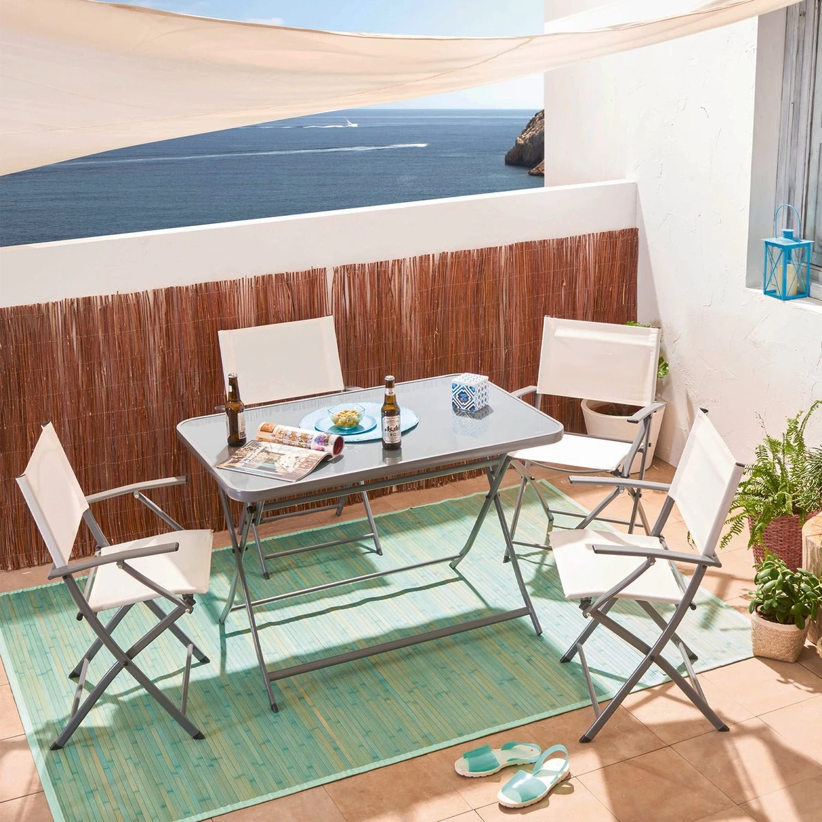 Idéal pour les petits espaces, ce lot de 4 chaises pliantes EMYS est conçu pour votre terrasse, jardin ou balcon. Les chaises de jardin sont pliables et peuvent être facilement rangées lorsqu’elles ne sont pas utilisées. Elles sont idéales pour s’asseoir dehors et profiter du beau temps. Ces chaises EMYS sont faciles à utiliser et restent durables grâce à leur structure en acier et leur assise en textilène. Ils sont résistants aux intempéries et peuvent supporter un poids allant jusqu’à 120 kg.