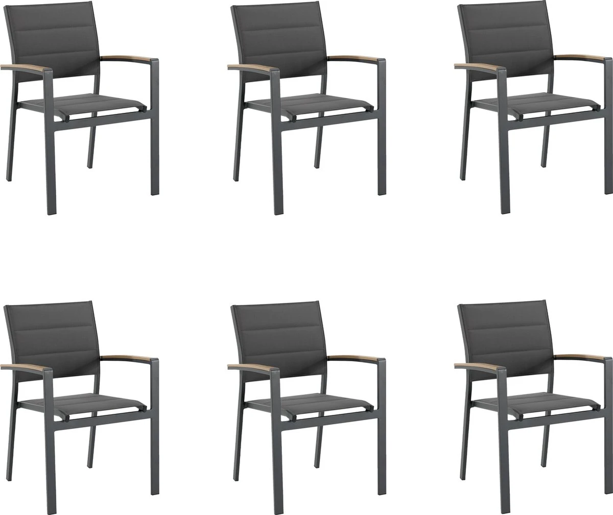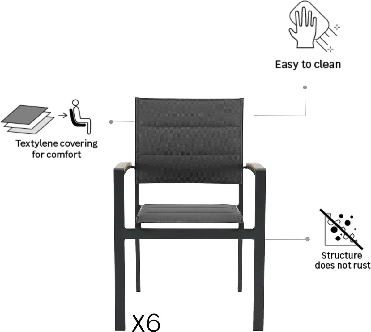 Idéal pour se détendre dans le jardin ou sur la terrasse, cet ensemble de six chaises de jardin avec accoudoirs SAN DIEGO vous offrira un confort optimal lors de vos repas en plein air. Conçues pour un usage quotidien, ces chaises de jardin sont légères et empilables, ce qui les rend faciles à ranger lorsqu’elles ne sont pas utilisées pour économiser de l’espace. L’assise et le dossier sont en textilène rembourré et vous offrent donc une assise confortable sans négliger la durabilité. Le tissu en PVC tissé est résistant, résistant aux intempéries et facile à nettoyer, tandis que le cadre en aluminium assure une résistance durable à la rouille et aux intempéries.