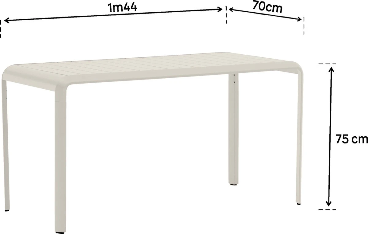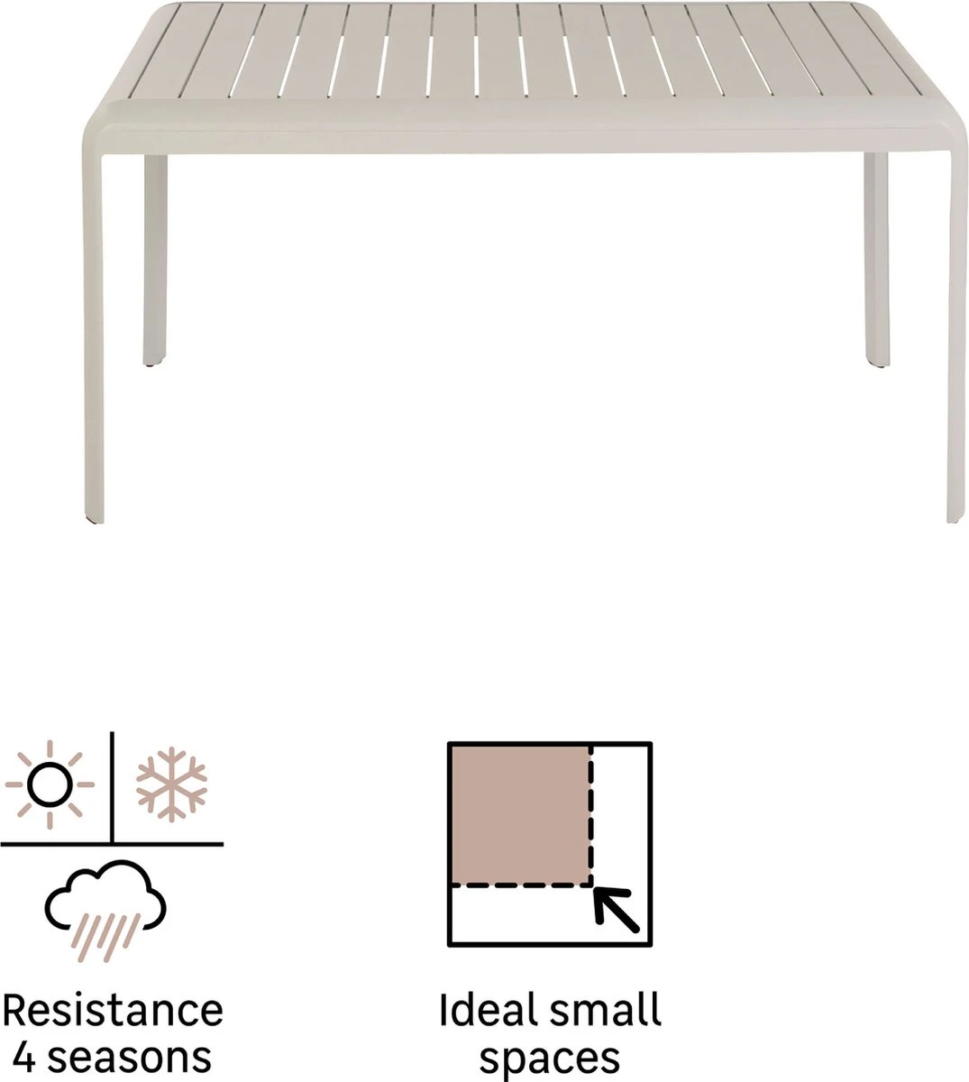 - Durable : la construction en aluminium résistant aux intempéries et les vis en acier inoxydable permettent de laisser la table à l’extérieur en permanence. En saison hivernale, il est recommandé de le recouvrir d’une housse de protection s’il n’est pas utilisé pendant une longue période.