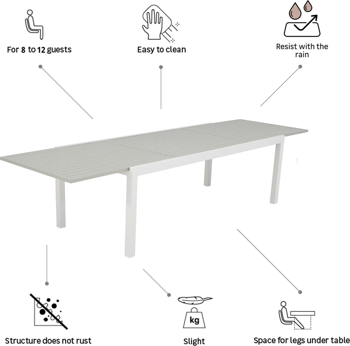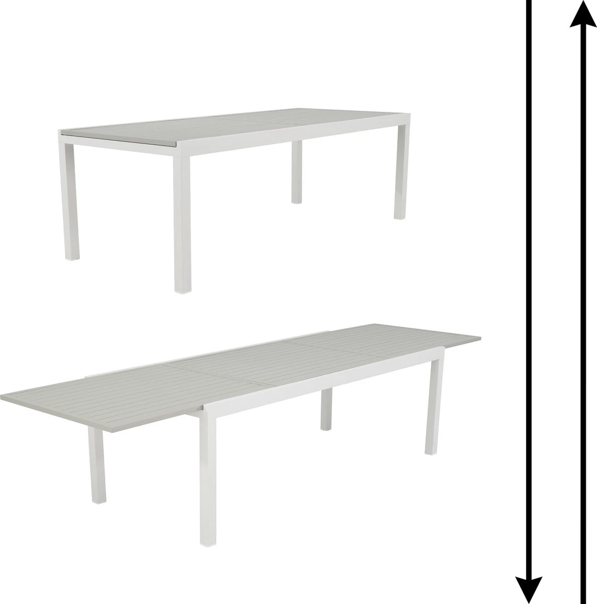 Cette table de jardin LAS VEGAS s’adapte à vos convives et à vos envies grâce à sa rallonge de 112 cm. Le plateau de la table peut être étendu de 224 à 336 cm en quelques secondes, offrant de la place pour jusqu’à 12 personnes. Avec ce système pratique, vous pouvez l’étendre et le rétracter d’une seule main. La table est idéale pour manger en famille ou entre amis par une journée ensoleillée. Le design angulaire de la table donne à votre salle à manger une touche moderne. Le plateau de table rectangulaire et les pieds carrés se marient parfaitement avec la couleur gris clair du plateau de table. La table est entièrement en aluminium pour résister aux fluctuations climatiques. Ce matériau est connu pour sa résistance et sa légèreté, ce qui facilite le déplacement de la table. Il résiste à la fois à l’humidité et à la rouille.