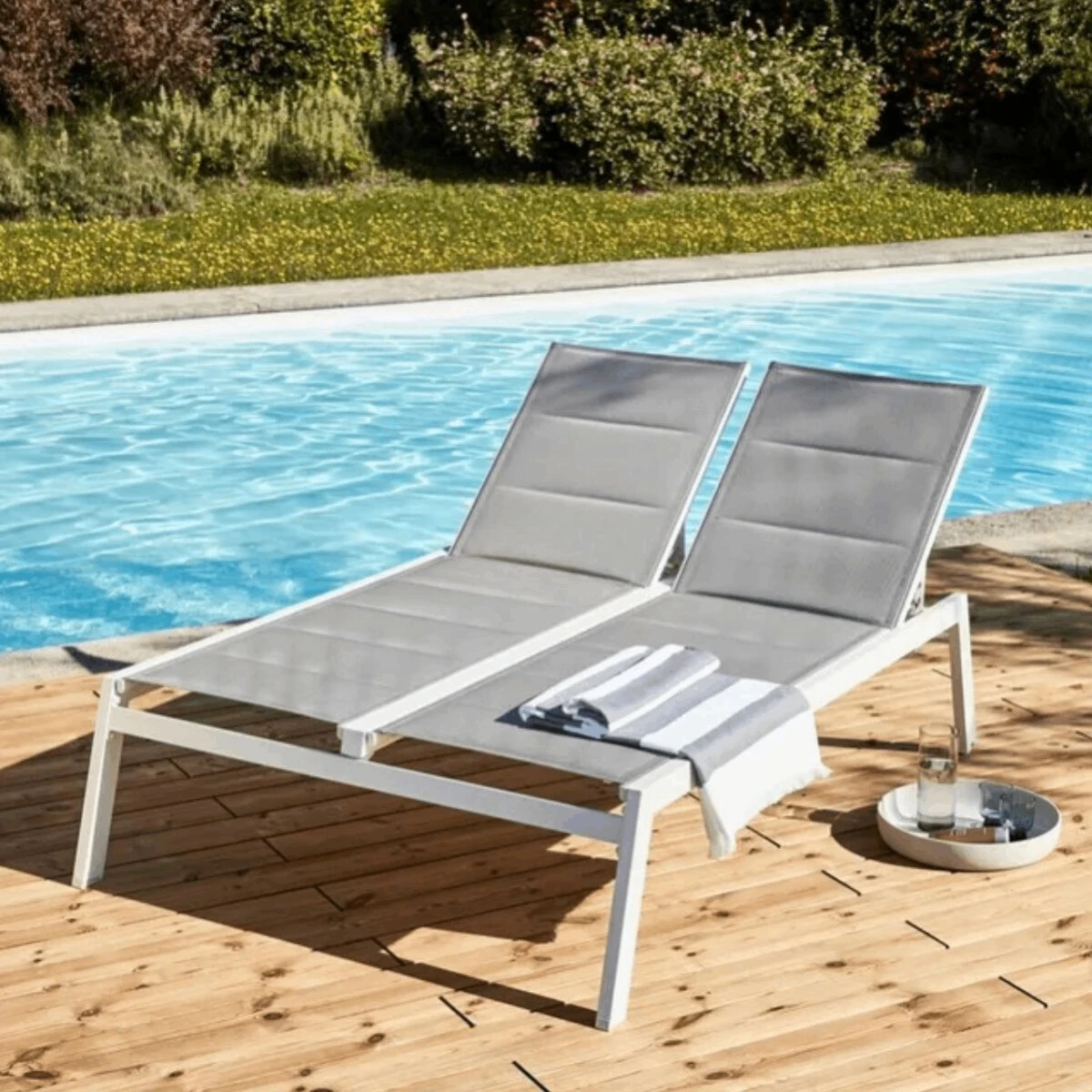 Ce bain de soleil double LISBOA est idéal pour lire, se détendre et se reposer à l’extérieur grâce à ses dossiers réglables selon cinq angles différents. Grâce à la double charpente, vous pourrez profiter d’un moment de détente dans le jardin en couple. Les deux côtés de la chaise longue peuvent être pliés et placés dans différentes positions pour une position assise ou allongée confortable. Les assises et dossiers en textilène vous accueilleront confortablement sans sacrifier la résistance. Afin de s’adapter pleinement au jardin, nos équipes ont apporté un grand soin au choix des matériaux. Le tissu Textilène est résistant aux intempéries et facile à nettoyer, et le cadre en aluminium garantit que vous êtes résistant aux intempéries et à la rouille.