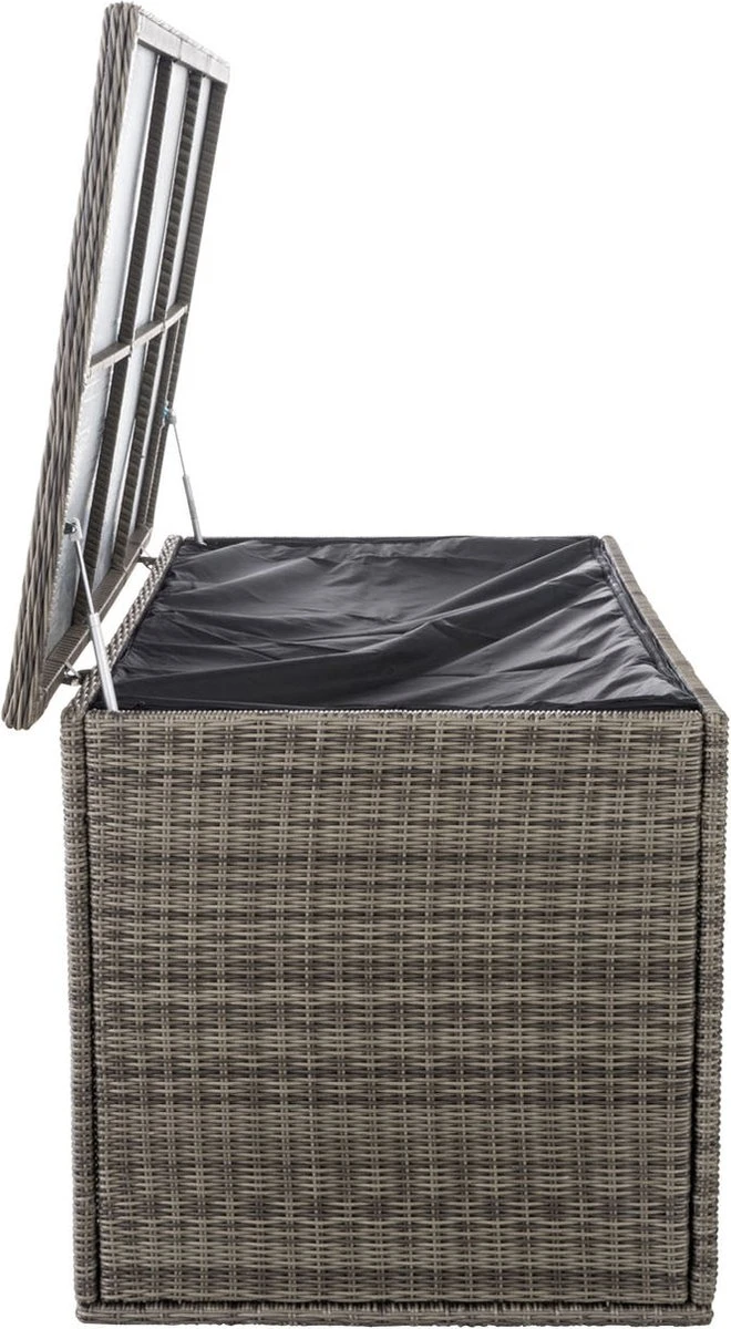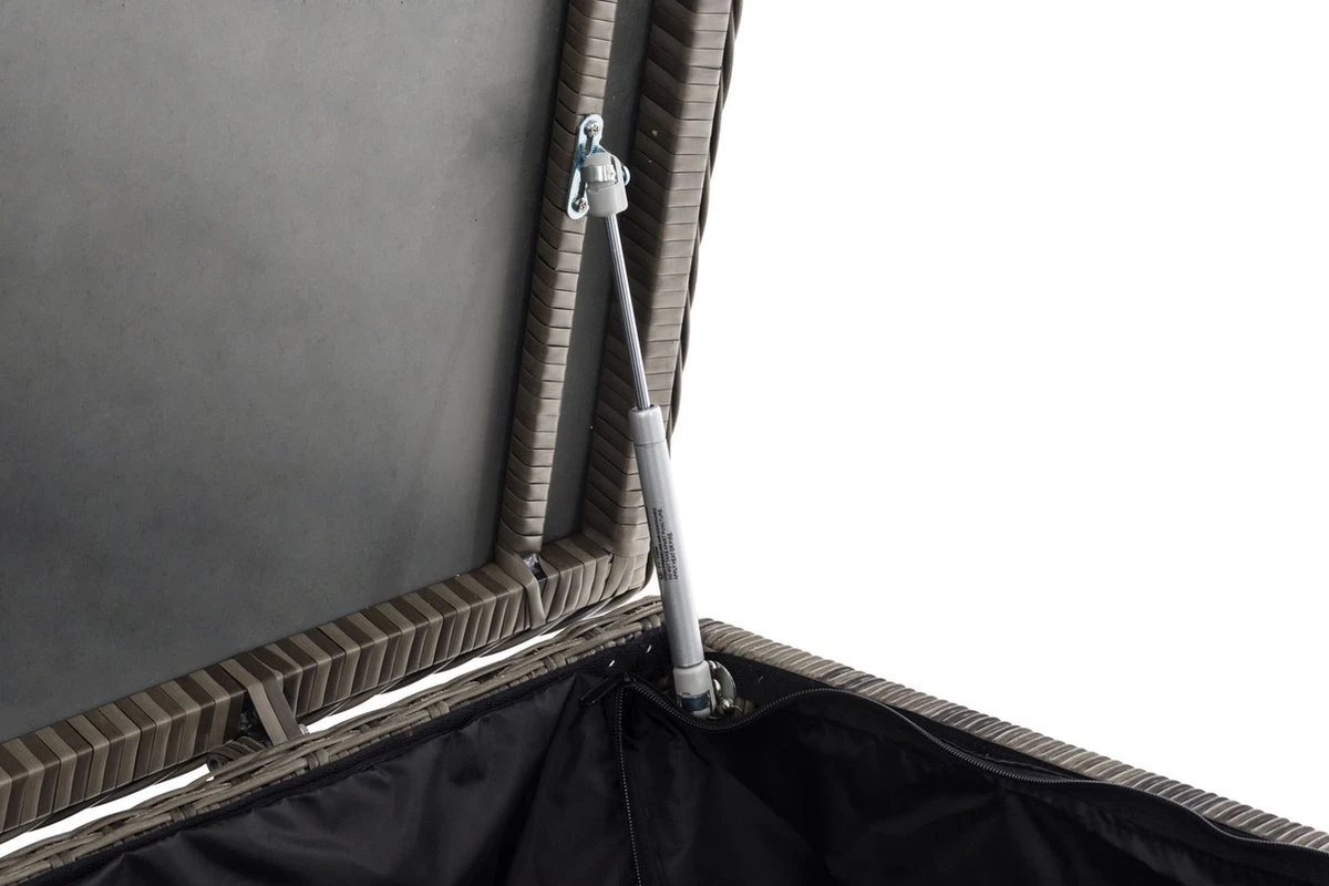 La housse de pluie zippée à l’intérieur de la boîte en polyrotin maintient les coussins, les tissus d’ameublement et les coussins complètement secs, mais peut également être retirée. Pour accéder au contenu de la boîte de rangement, le couvercle peut être facilement ouvert grâce à deux amortisseurs à ressort à gaz.