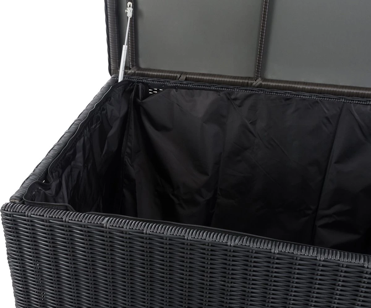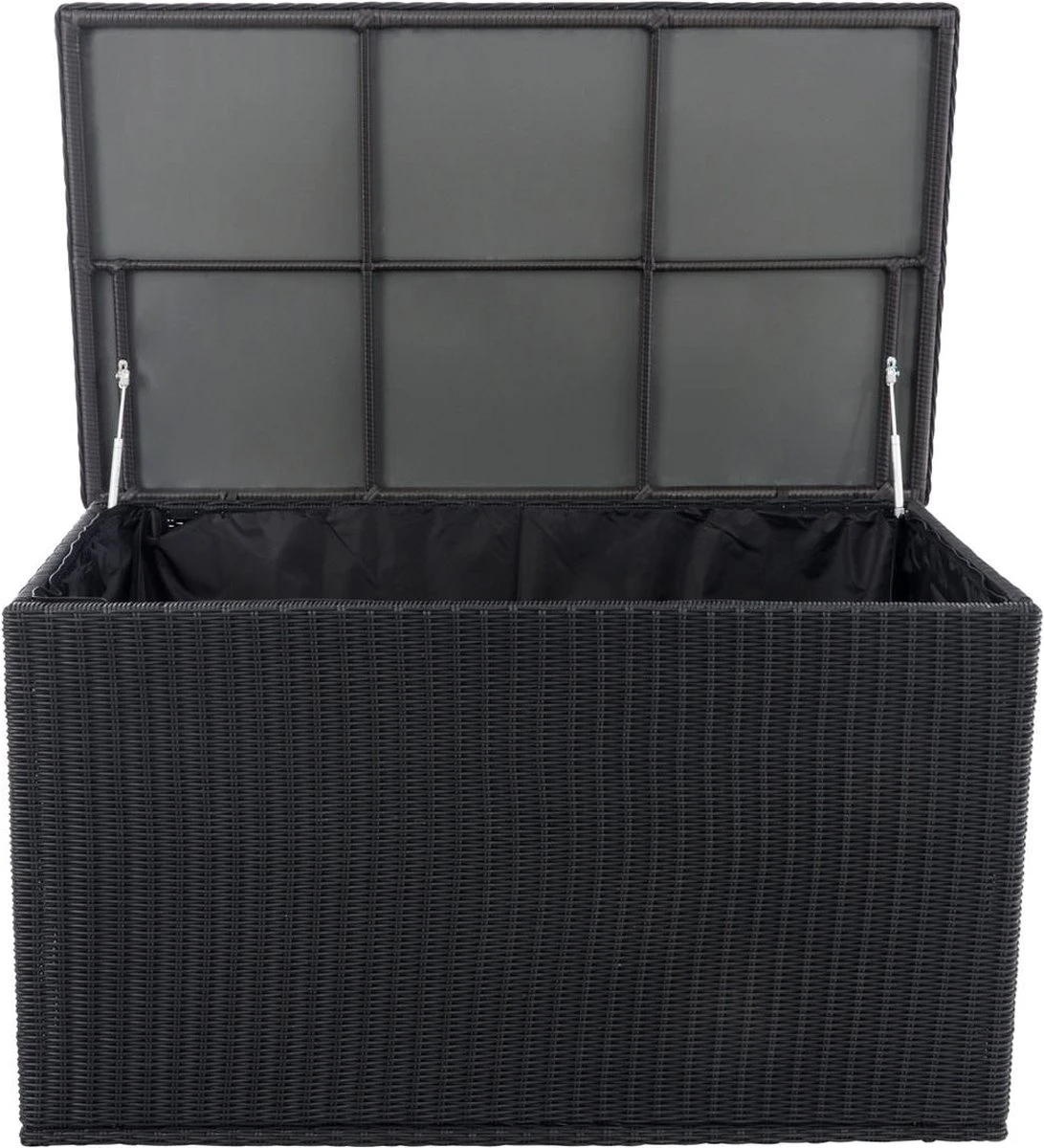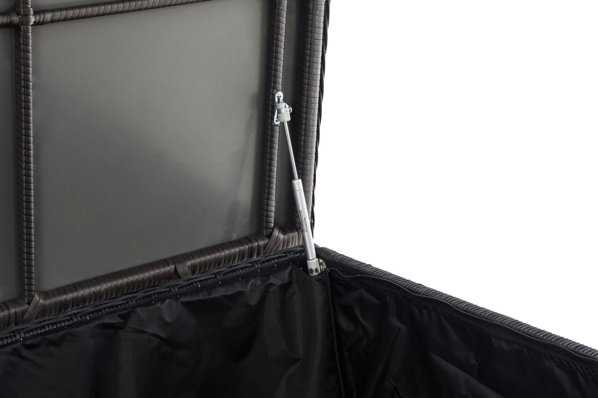 La housse de pluie zippée à l’intérieur de la boîte en polyrotin maintient les coussins, les tissus d’ameublement et les coussins complètement secs, mais peut également être retirée. Pour accéder au contenu de la boîte de rangement, le couvercle peut être facilement ouvert grâce à deux amortisseurs à ressort à gaz.