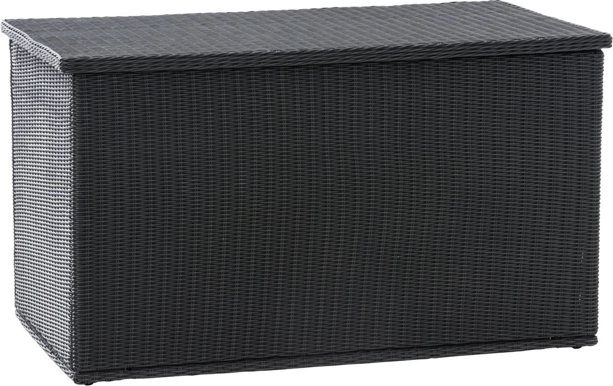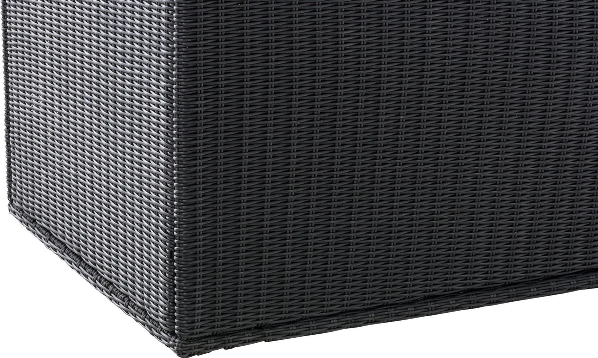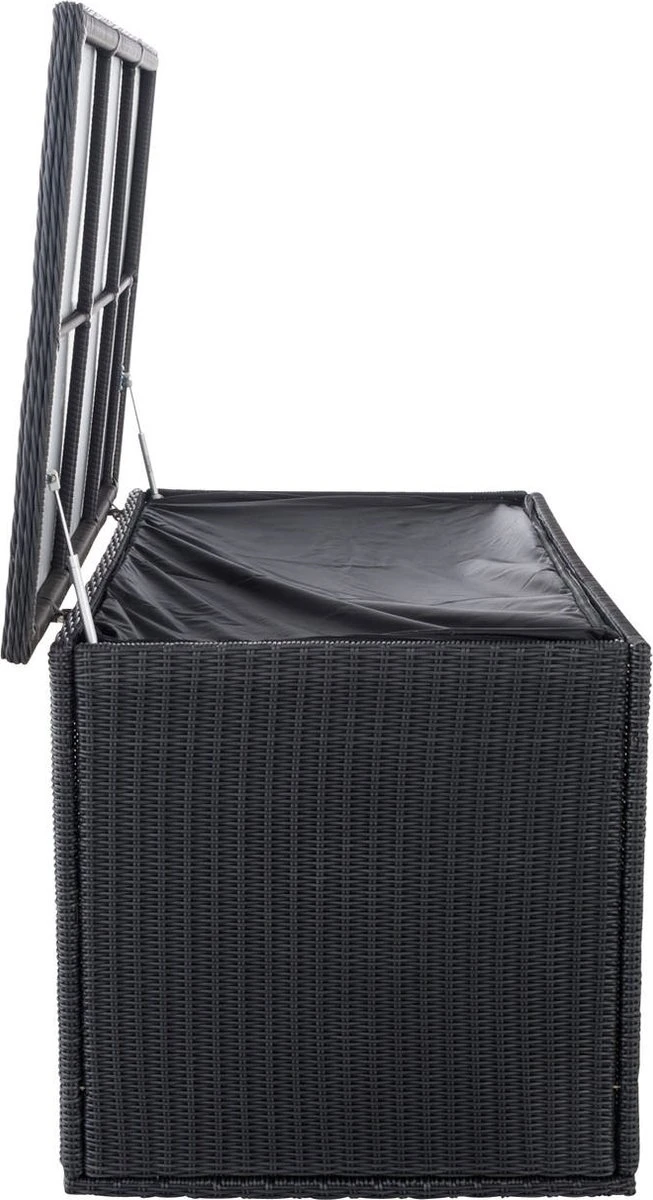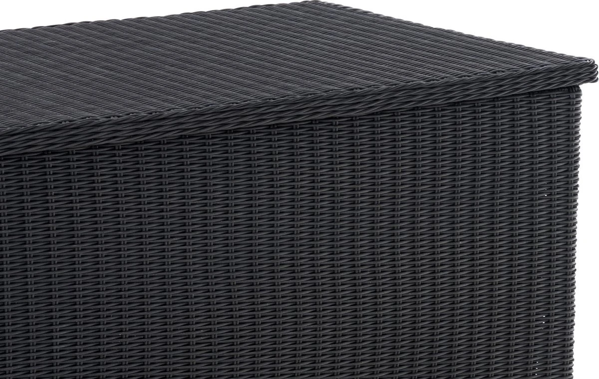 La housse de pluie zippée à l’intérieur de la boîte en polyrotin maintient les coussins, les tissus d’ameublement et les coussins complètement secs, mais peut également être retirée. Pour accéder au contenu de la boîte de rangement, le couvercle peut être facilement ouvert grâce à deux amortisseurs à ressort à gaz.