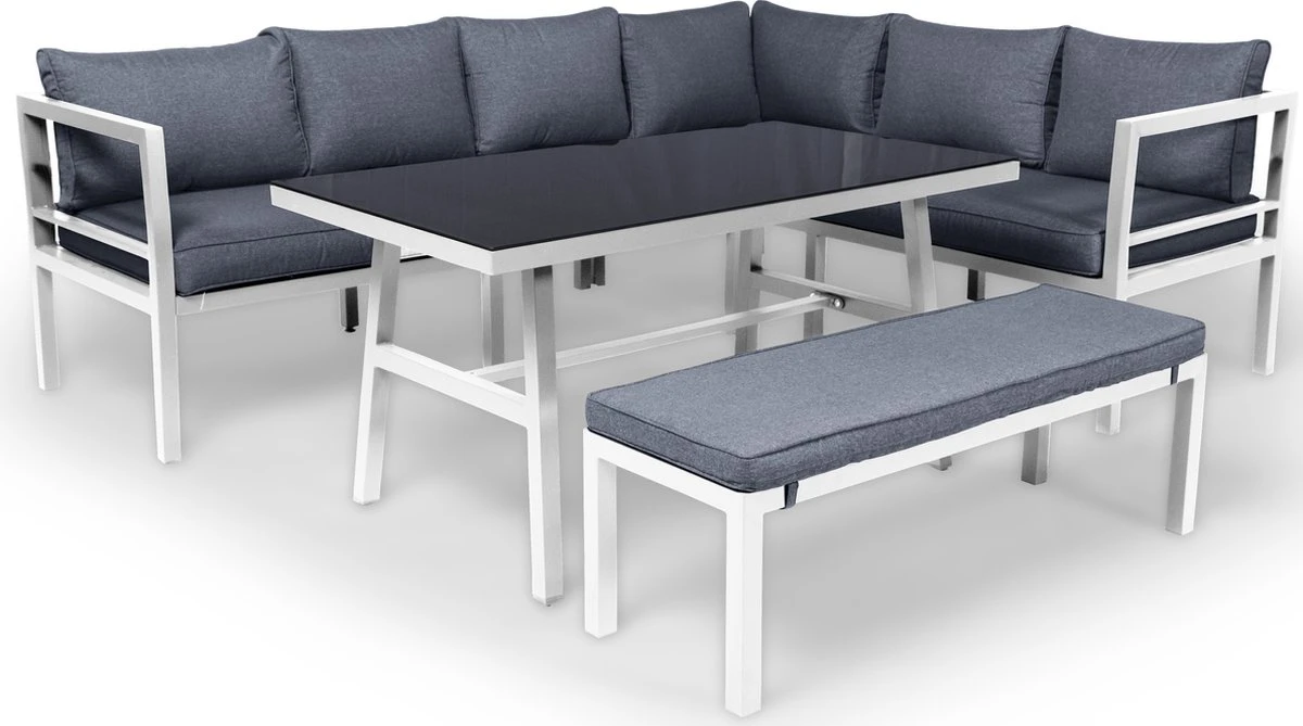 L’ensemble se compose de deux bancs que vous pouvez assembler ensemble, d’un banc séparé et d’une table haute sur laquelle il fait très bon s’asseoir et dîner. La plaque de verre sur la table est durcie, elle est donc très élégante. Se prélasser dans votre jardin n’a jamais été aussi attrayant !
