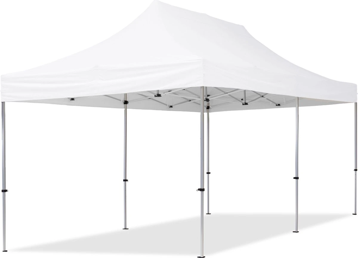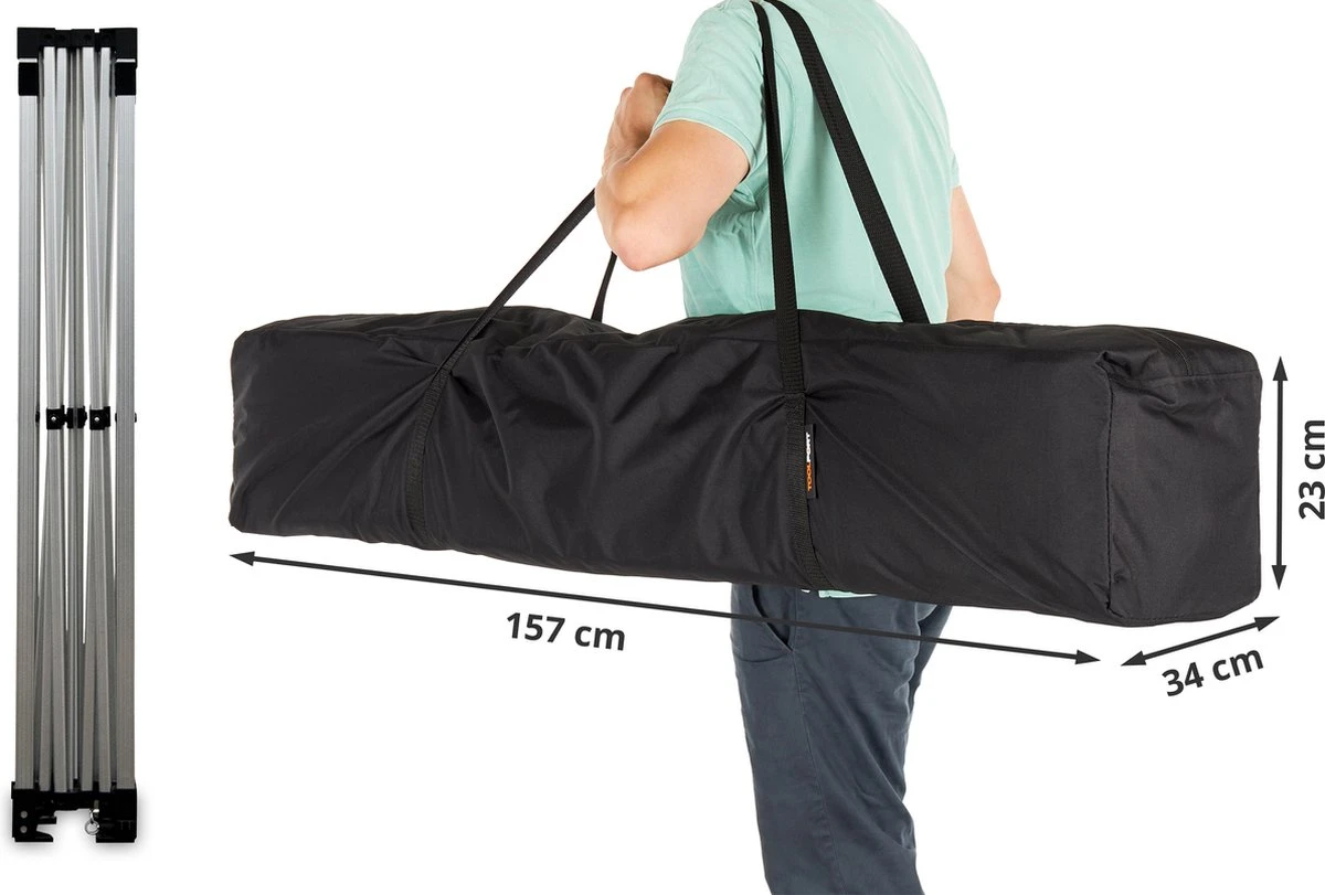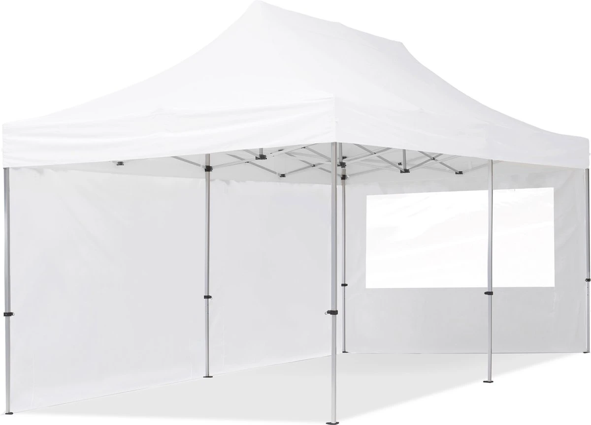 Cette tente de réception Easy Up de haute qualité est idéale pour une utilisation mobile. Grâce au cadre en aluminium, la tente est particulièrement légère et facile à transporter et à ranger dans le sac gratuit fourni. Pour une résistance accrue, le cadre en aluminium a été traité via un procédé éloxal et est donc 15 fois plus résistant que l’aluminium n’ayant pas subi ce procédé. Les pieds du cadre ont un profil carré robuste avec un diamètre d’environ 32 mm et une épaisseur de paroi d’environ 1 mm. La charpente du toit a des connecteurs en nylon solide et fixés avec des vis, ce qui rend toutes les pièces remplaçables. Le mécanisme à ciseaux de la tente de fête permet d’installer et de démonter la tente en 1 minute. Les pieds sont sécurisés avec un système de clic. La bâche de toit est composée d’environ 300 g / m² de polyester lourd, enduit de PVC, haute performance et est 100% étanche! La tente de fête Easy Up peut être ajustée à 5 hauteurs.