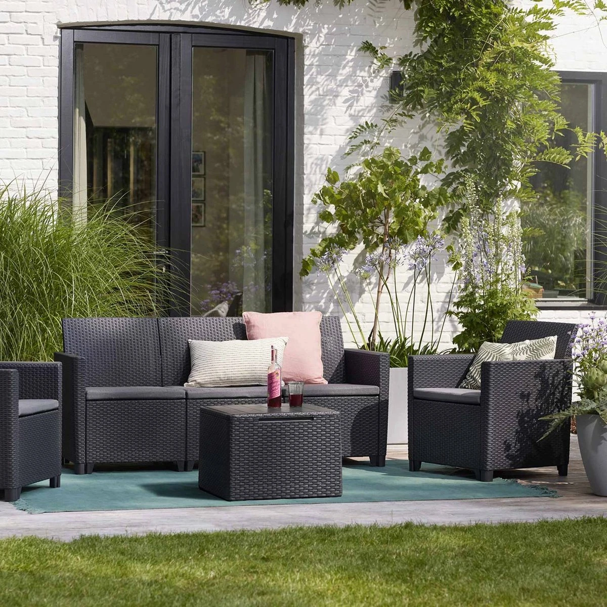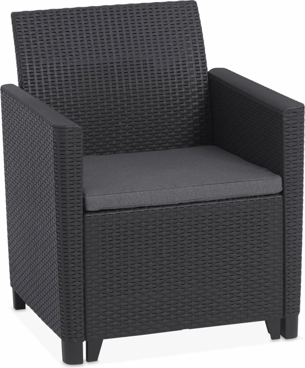 Cet ensemble de salon pour 5 personnes est très facile à entretenir et sa couleur graphite convient à tous les jardins. Les coussins des chaises se rangent facilement grâce à la table basse avec espace de rangement.