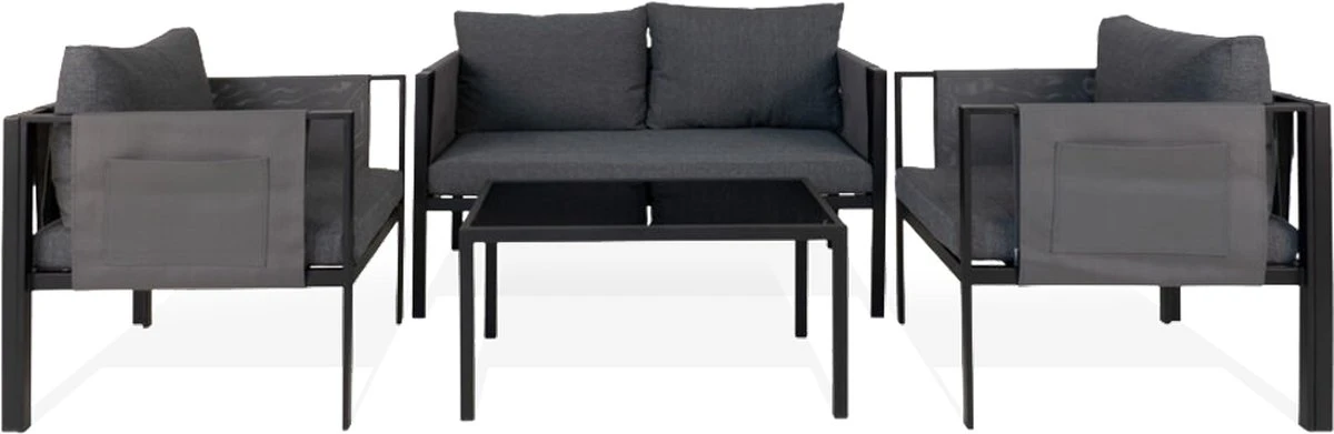 L’ensemble lounge Fardau se compose de deux chaises longues, d’un canapé lounge et d’une table basse. Les dimensions des chaises sont de 68 cm de largeur x 72 cm de profondeur x 66 cm de hauteur. La taille du canapé est de 124 cm de large x 72 cm de profondeur x 66 cm de haut. La taille de la table basse est de 80 cm de long x 50 cm de large x 40 cm de haut. La structure de ce mobilier de jardin est en acier thermolaqué noir et l’assise et les coussins d’assise sont en polyester. La table basse est également en métal et possède un plateau en verre trempé. Cet ensemble de salon est particulièrement adapté à une utilisation en extérieur, mais pour conserver longtemps la beauté du produit, nous vous recommandons de rentrer les coussins d’assise à l’intérieur après utilisation et de ranger ou de recouvrir l’ensemble de l’ensemble en hiver.