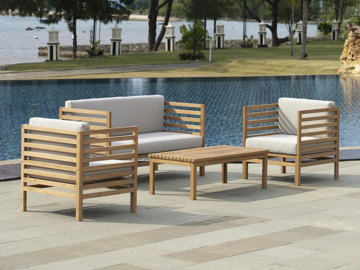 Le salon de jardin LINERI donne une touche d’exotisme à votre jardin avec son bois de teck couleur naturelle et son design épuré.