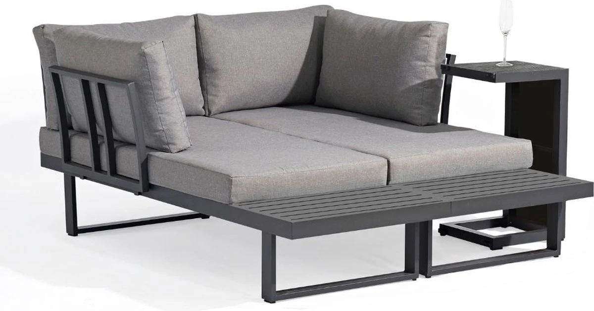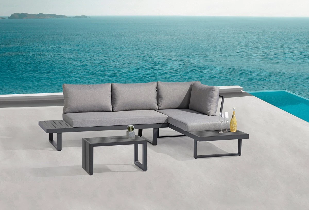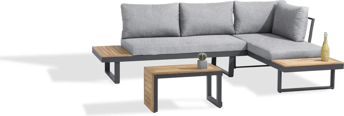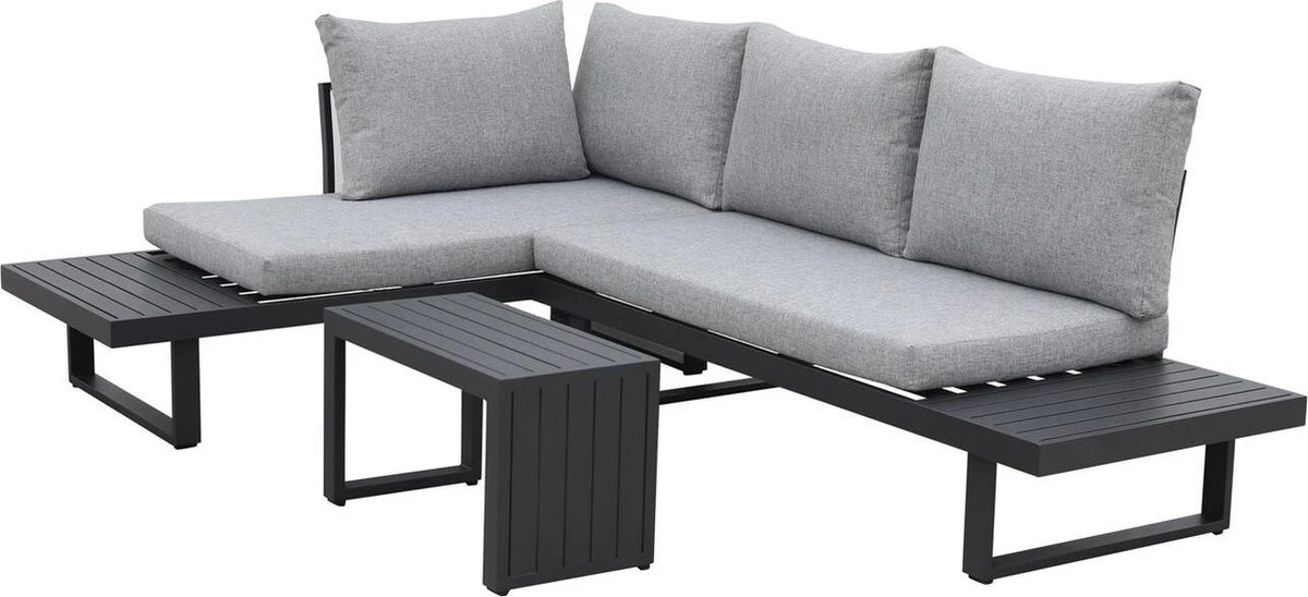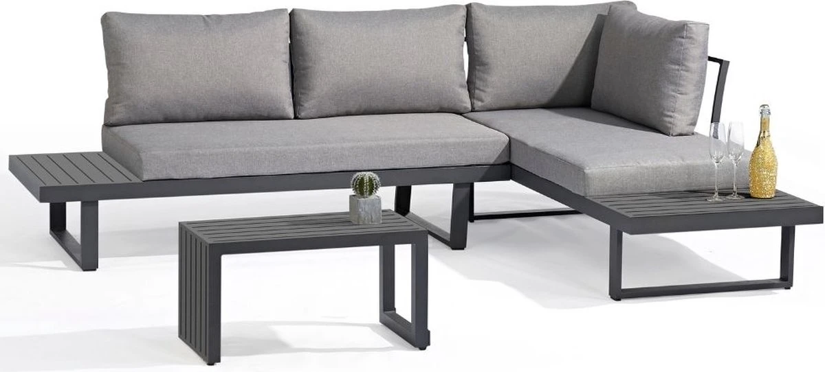 Créez un coin salon dans le jardin où vous pourrez boire un verre en plaçant le SenS-Line Elba à l’extérieur. Salon moderne et multifonctionnel Delphi 4 places de la marque SenS-Line. L’ensemble de salon est composé d’un cadre en aluminium robuste, ce qui signifie qu’il y a suffisamment de capacité portante pour s’asseoir dessus avec 4 personnes. Cet ensemble de salon de SenS-Line avec des coussins en polyester gris assortis qui correspondent au look aluminium. L’ensemble se compose de 2 bancs aux dimensions L 175 x l 78 x H 70 et d’une table d’appoint aux dimensions L 70 x l 35 x H 38 centimètres. L’ensemble peut être monté de différentes manières, comme indiqué sur les images. De cette façon, vous pouvez placer et ajuster l’ensemble de salon à eigen wens .
